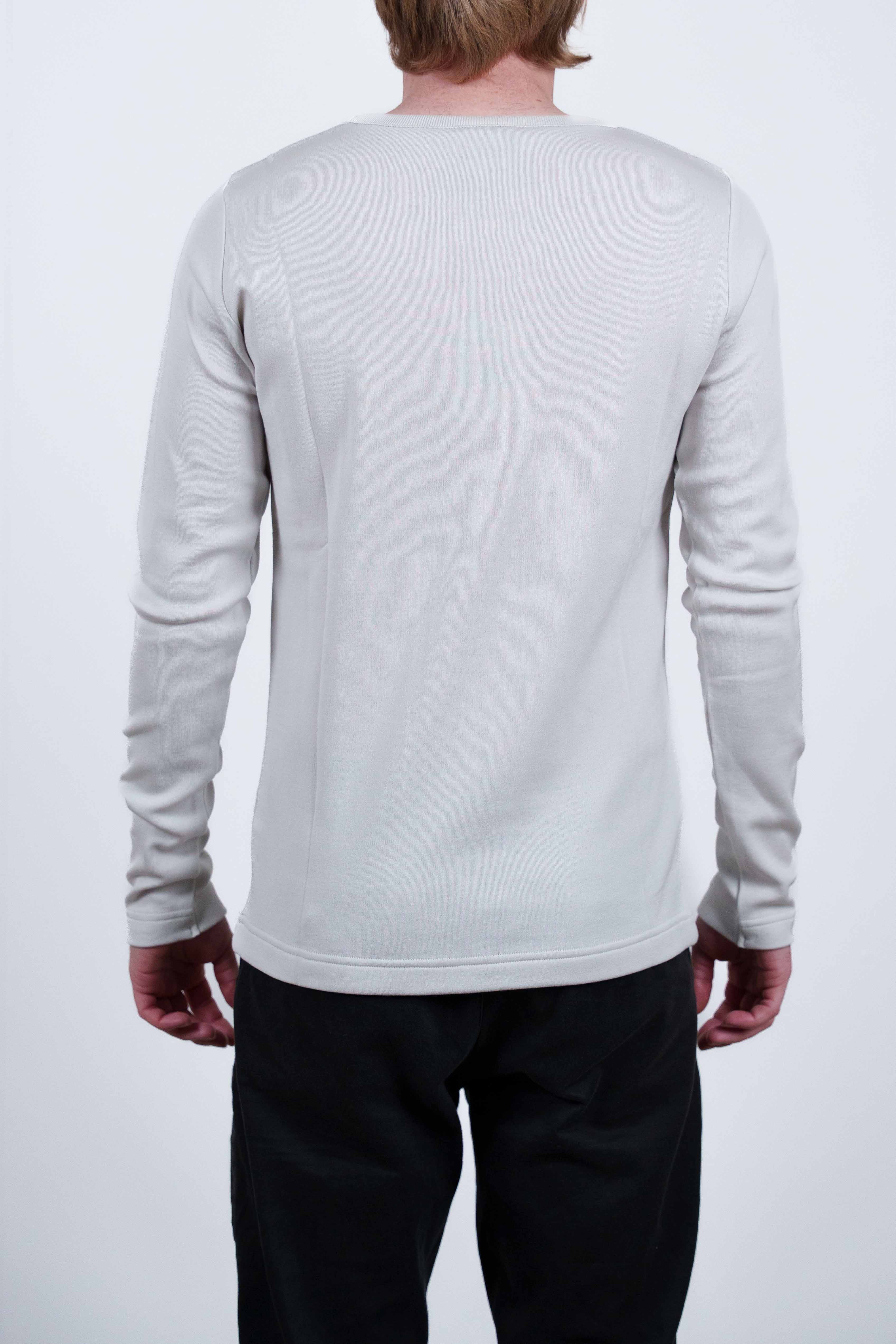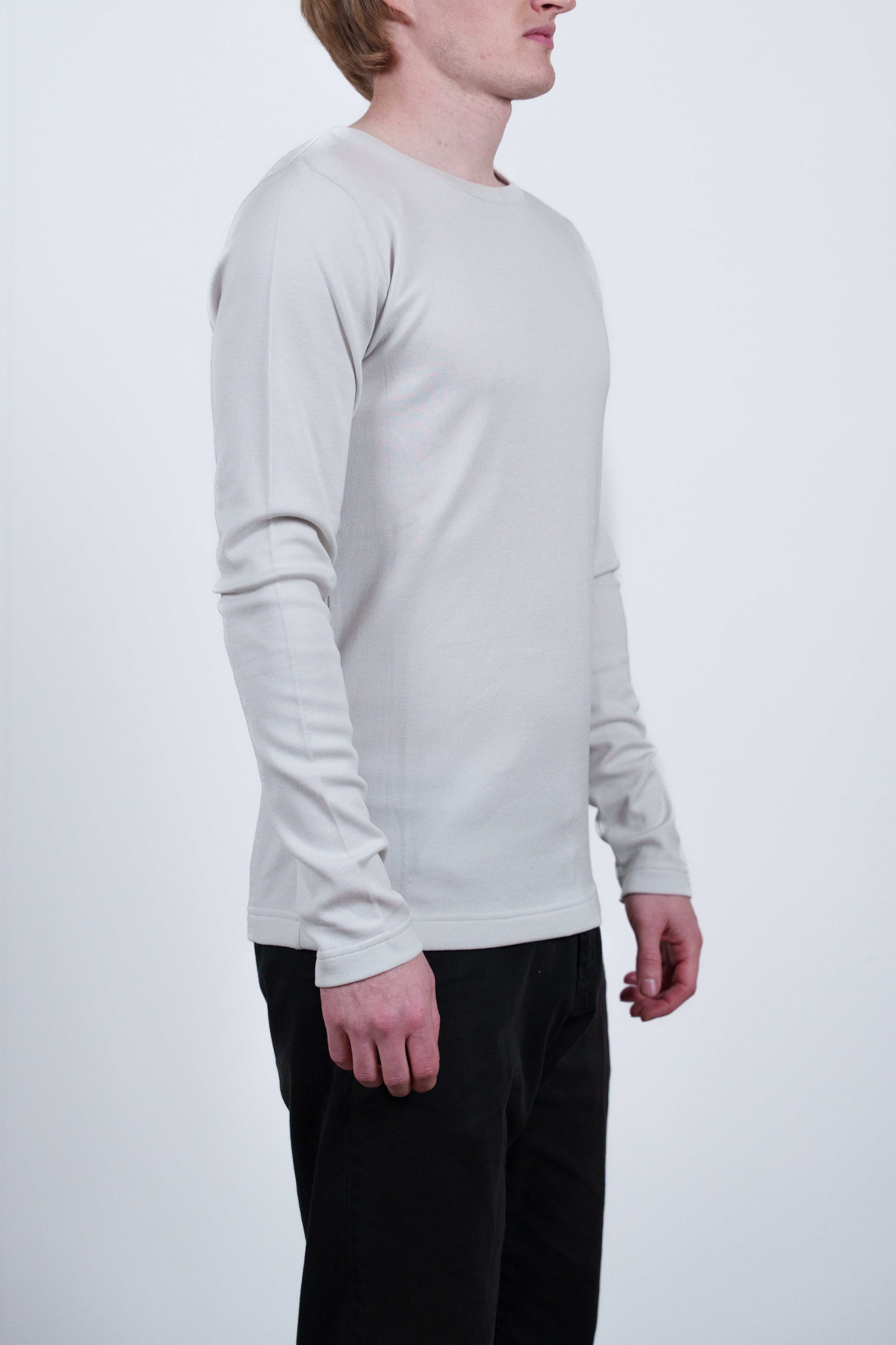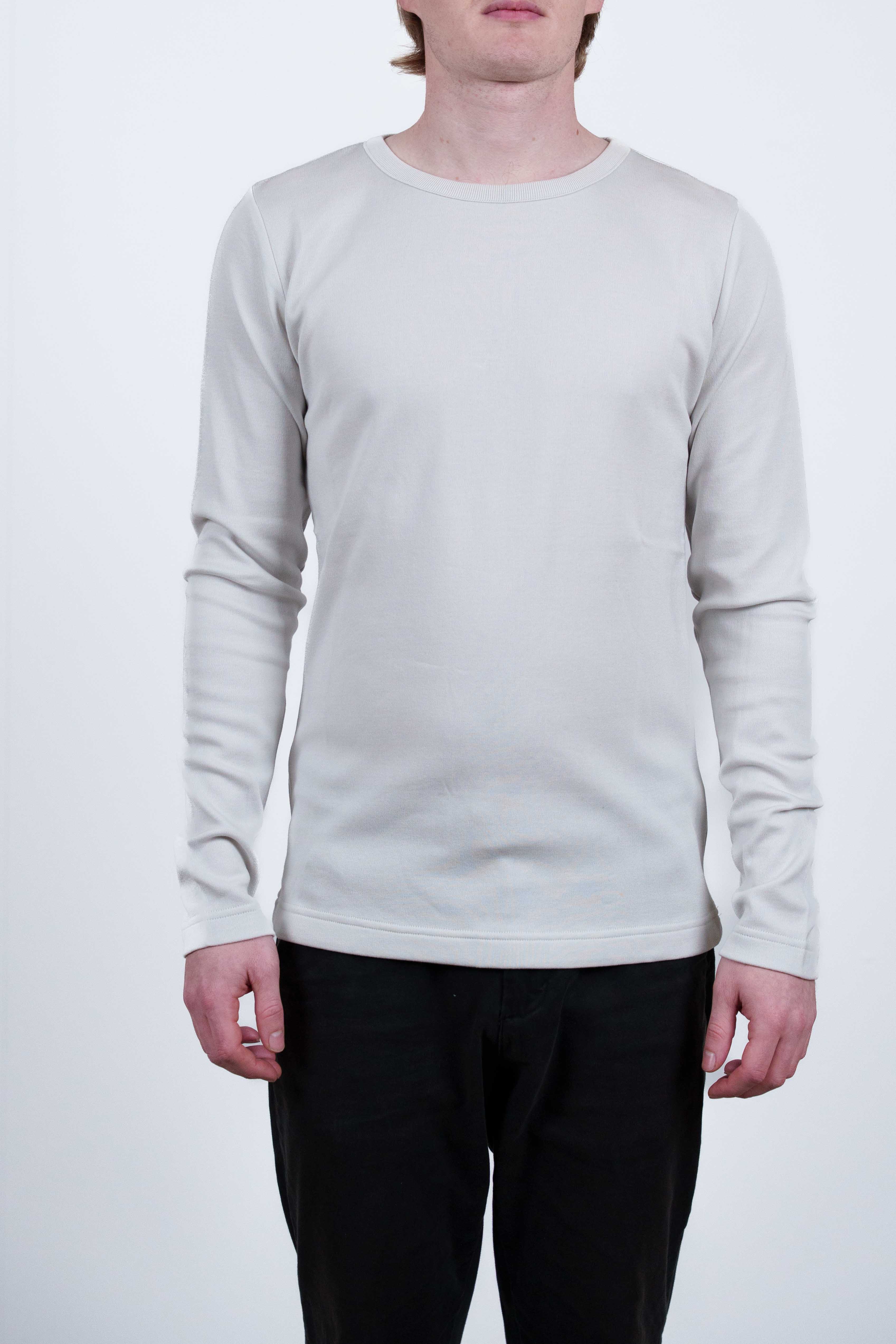 Light grey, long-sleeve sweater from the SS16 collection, featuring a crew neck. Made from a fine knit fabric, with ribbed detailing on the collar and sleeves, and a smoother texture on the body.