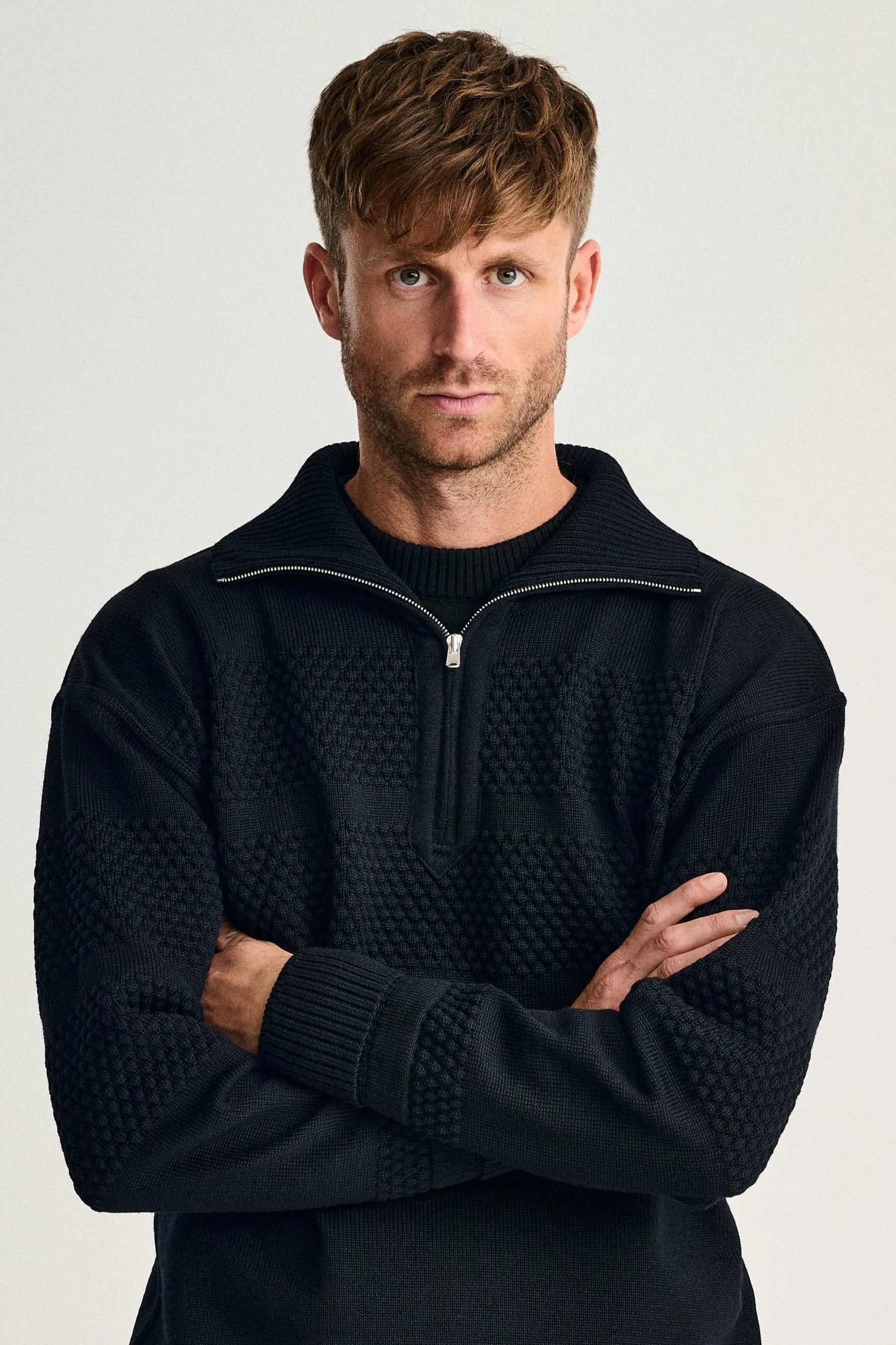 TECHNICAL DESCRIPTION | The collar is a double-layered and folded 2x1 rib. The cuffs are a matching 2x1 rib, also double-layered, folded and reinforced for durability. The closure is a RIRI zip neck. |