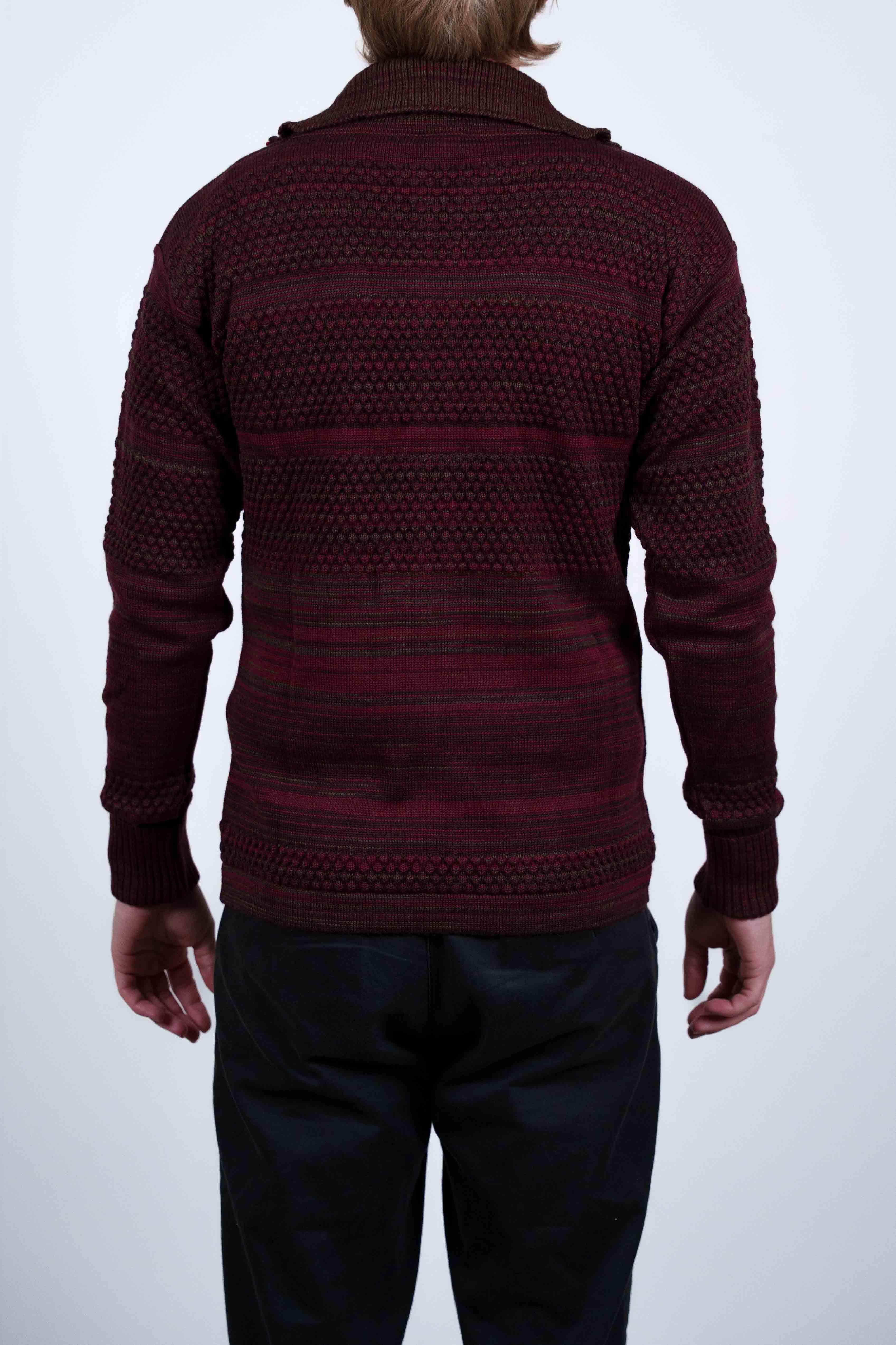 Full-zip sweater from our W014 collection in a deep red, maroon, and brown melange knit. It features textured bubble stitch panels and horizontal striped sections, with ribbed cuffs and hem, and a stand-up collar.