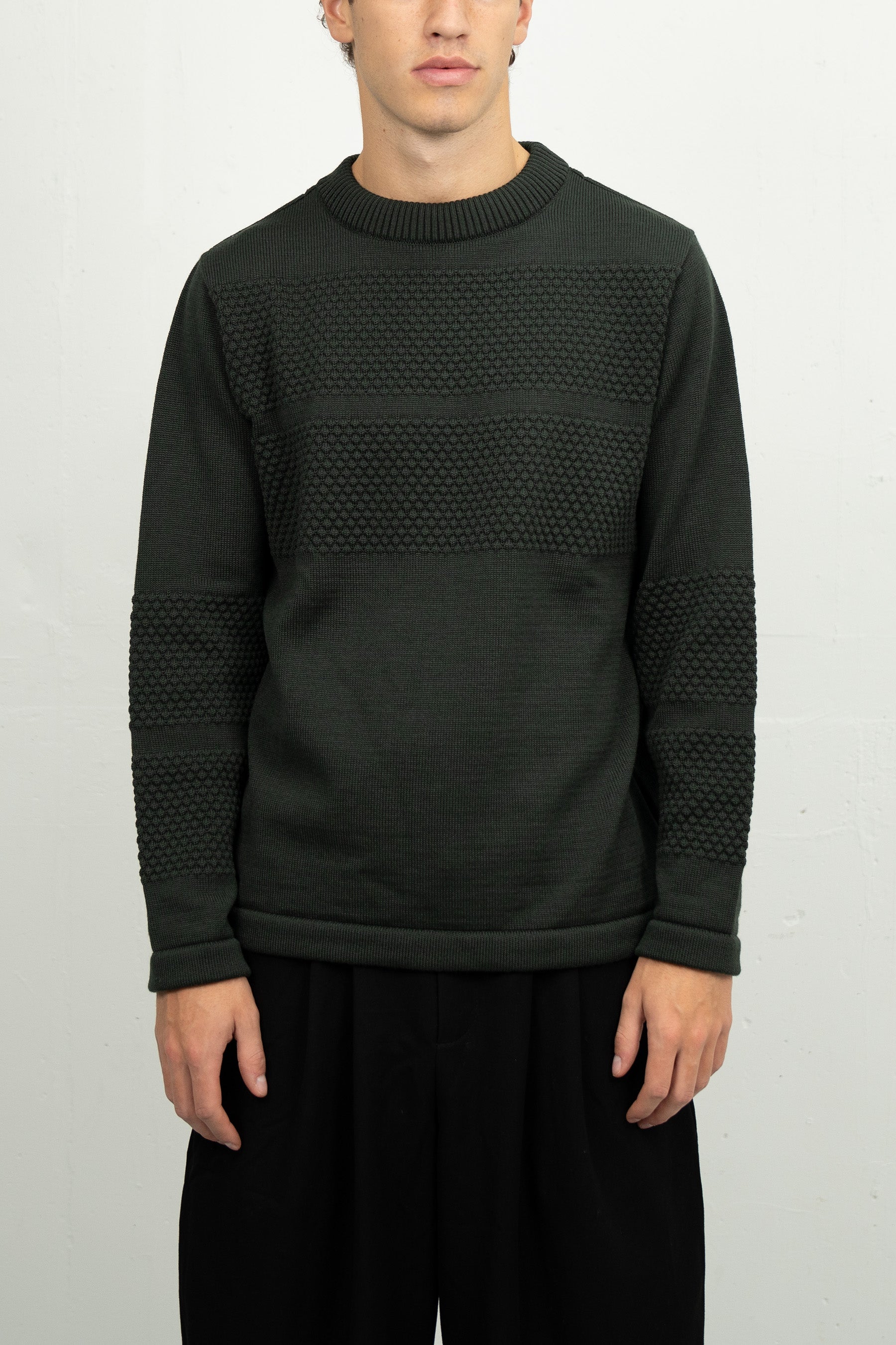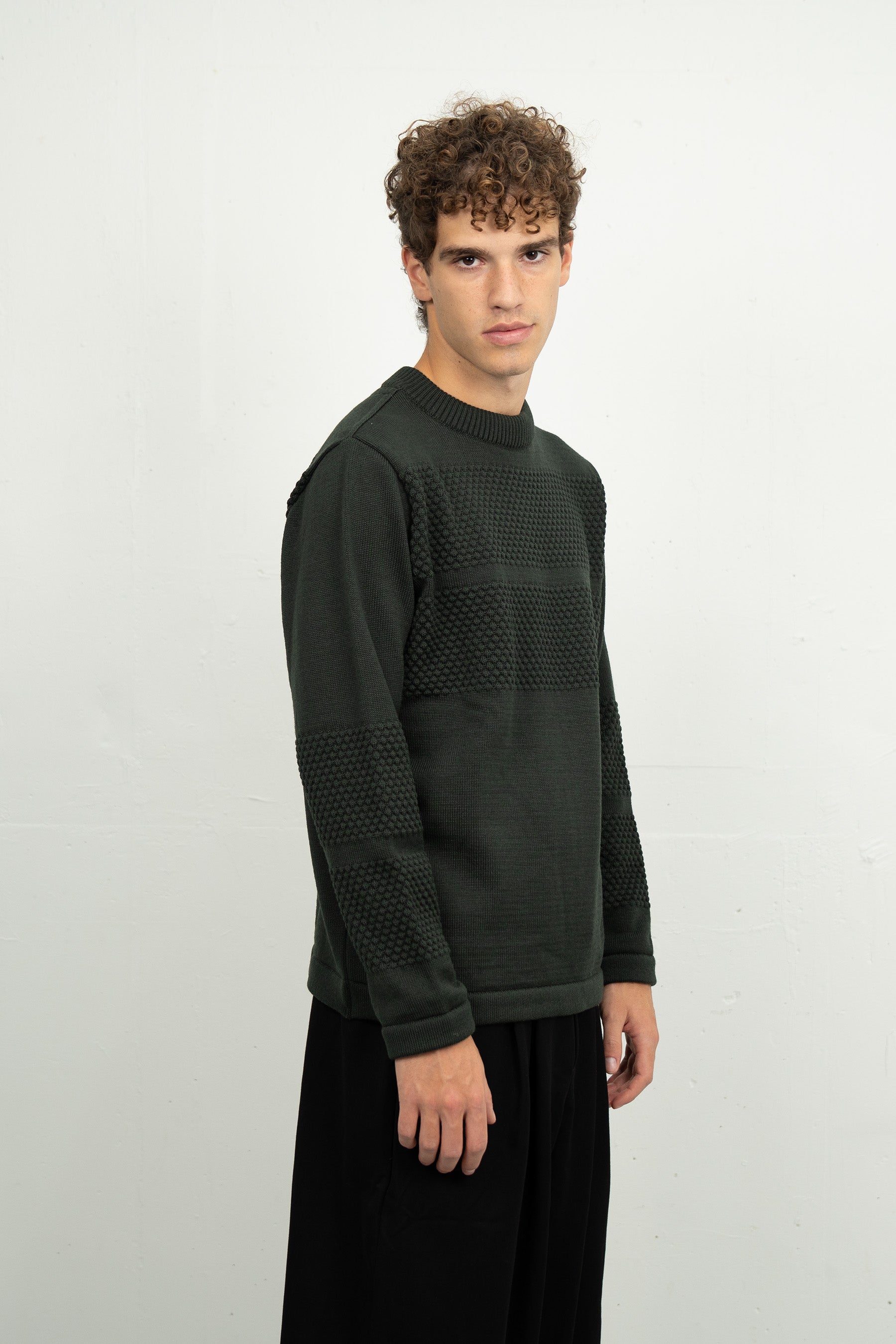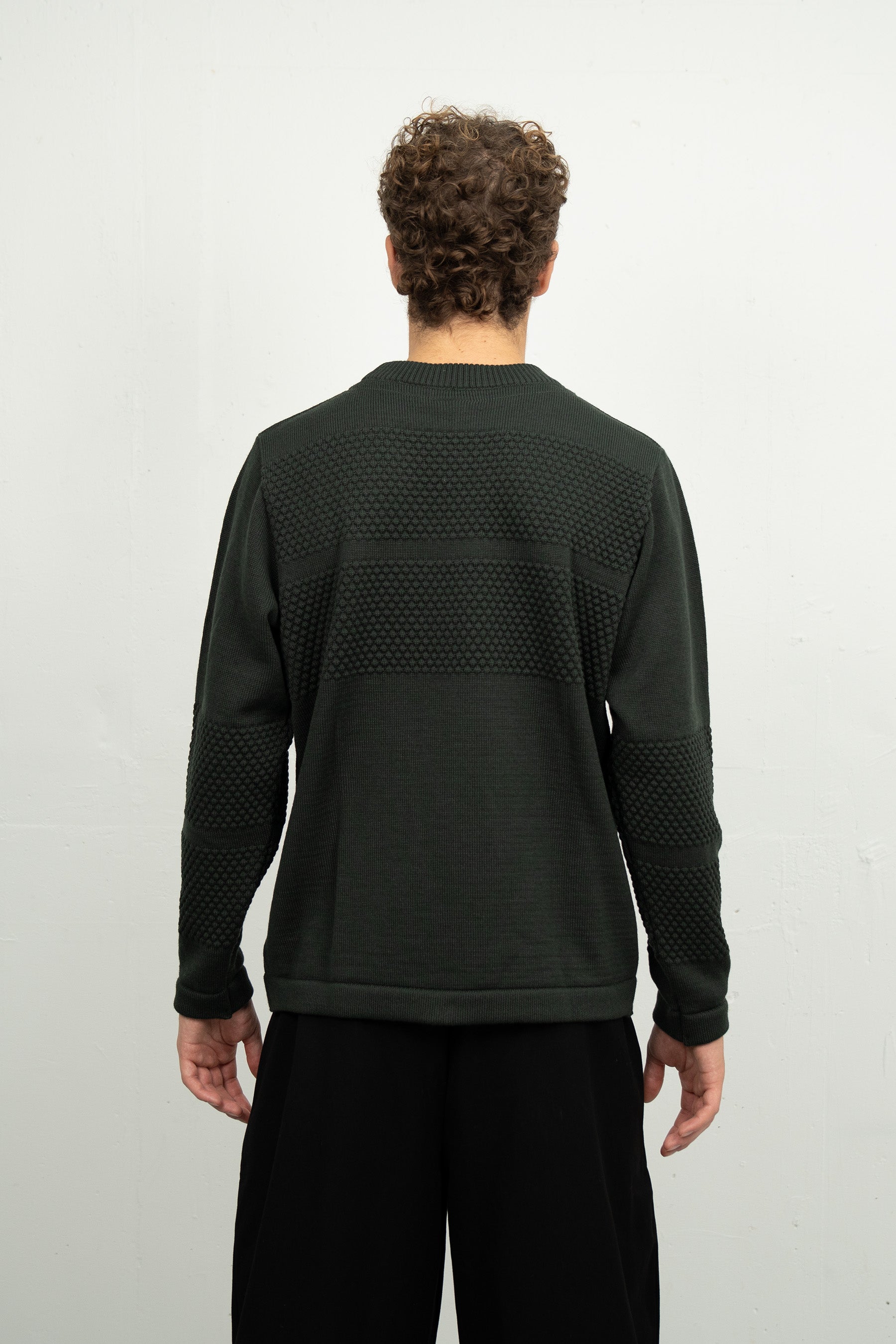 TECHNICAL DESCRIPTION The collar is a double-layered 2x1 rib, reinforced to ensure it holds its shape. The cuffs are seamlessly tubular-knit for a clean and comfortable finish. The hem is constructed with a seamless tubular knit for a consistent and refined edge.