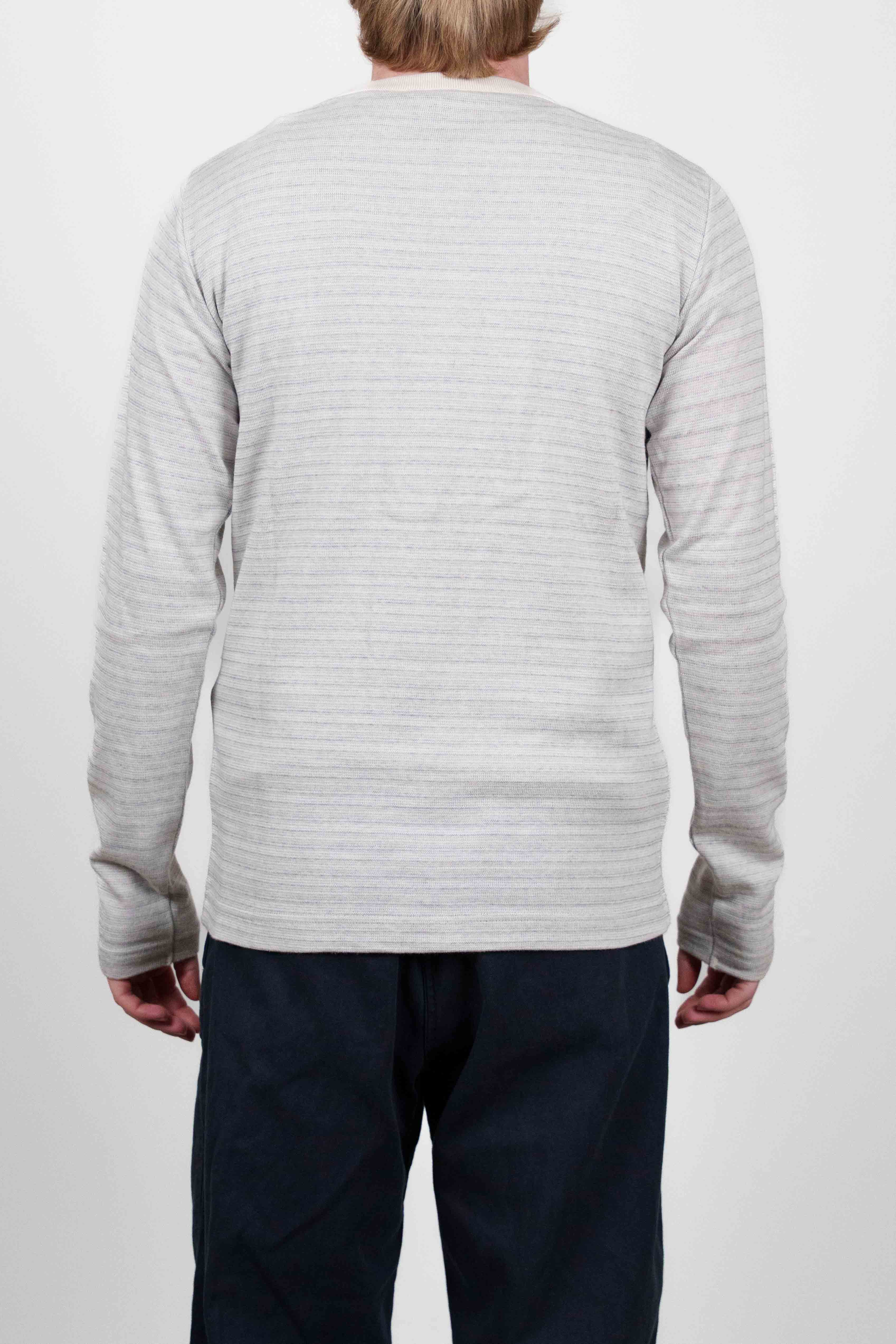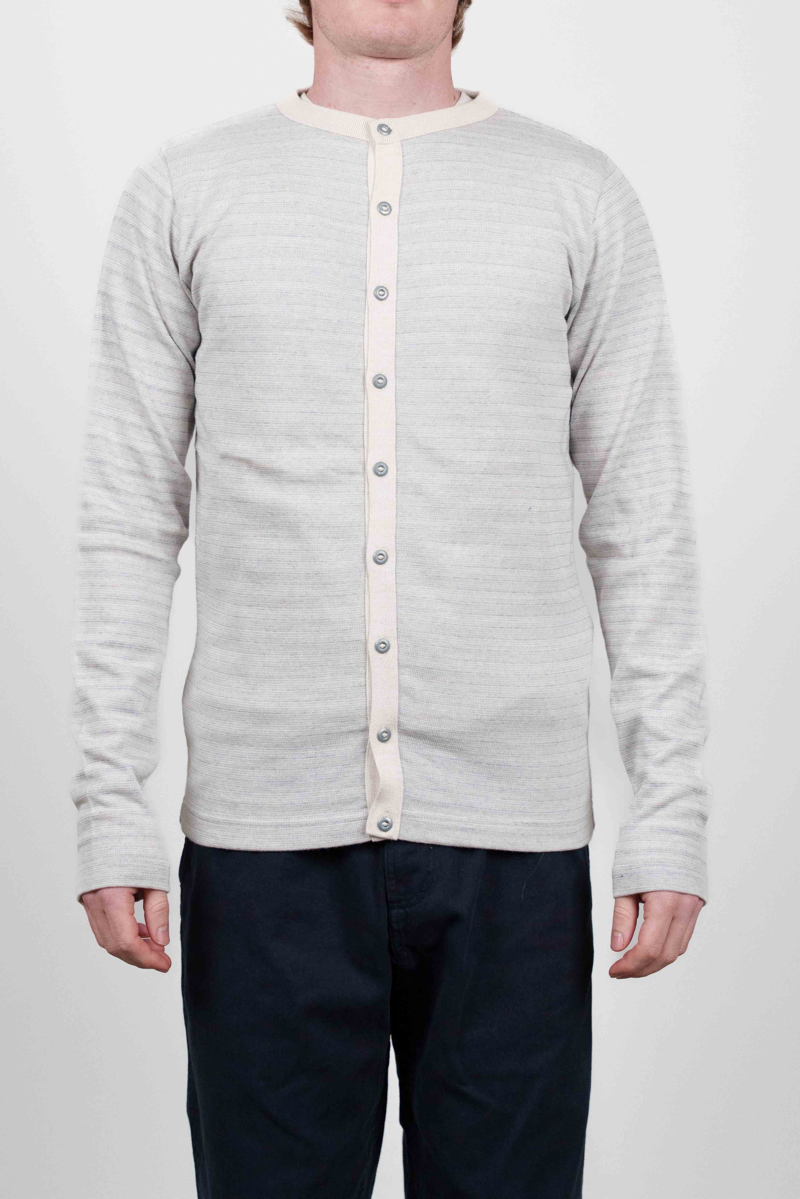 Light grey long-sleeve cardigan from the SS14 collection, featuring a cream button placket and collar. It has a subtle horizontal striped knit texture, giving it a lightweight and refined look.