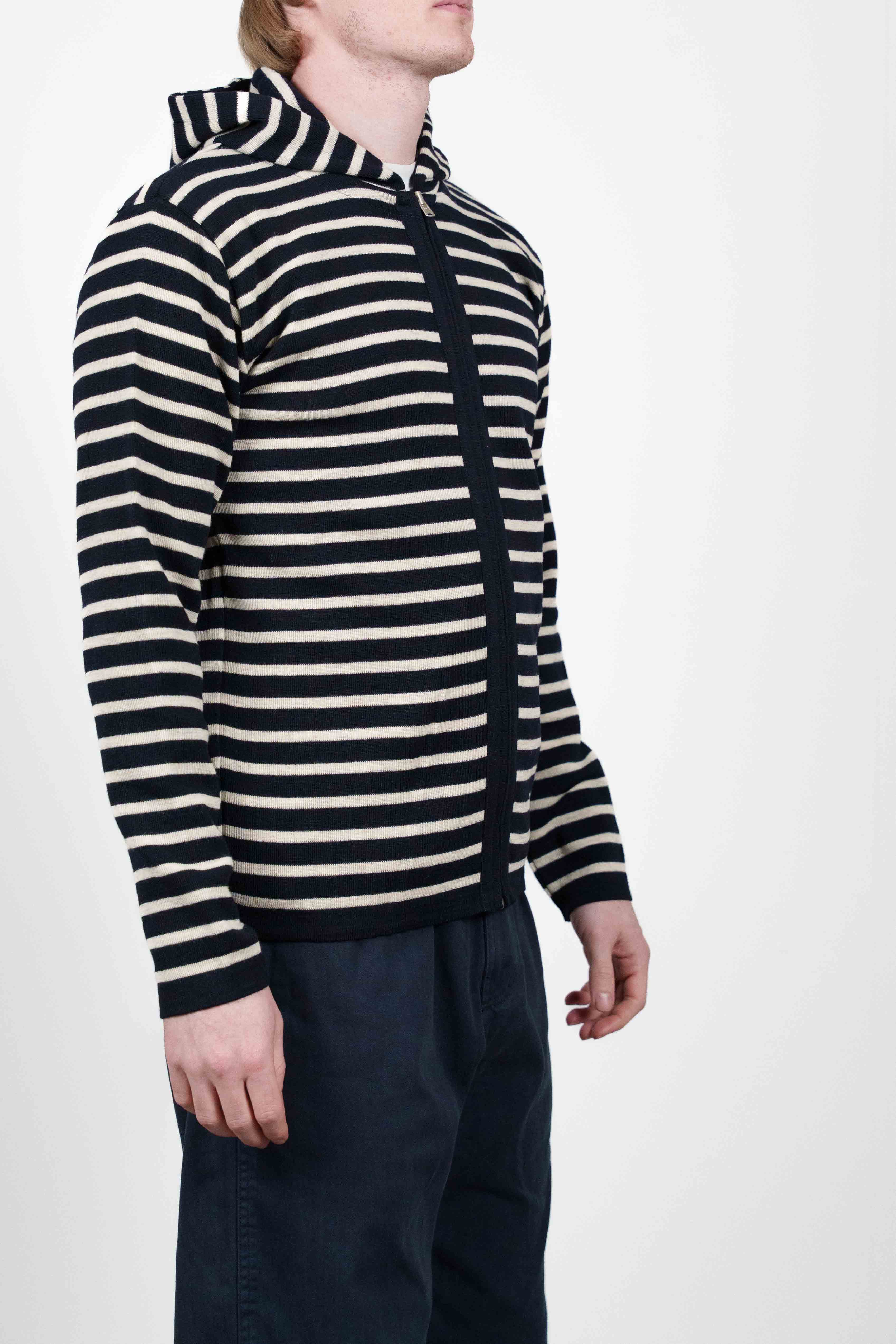 Striped hoodie in deep navy and off-white from our W013 collection, featuring a full-zip front.