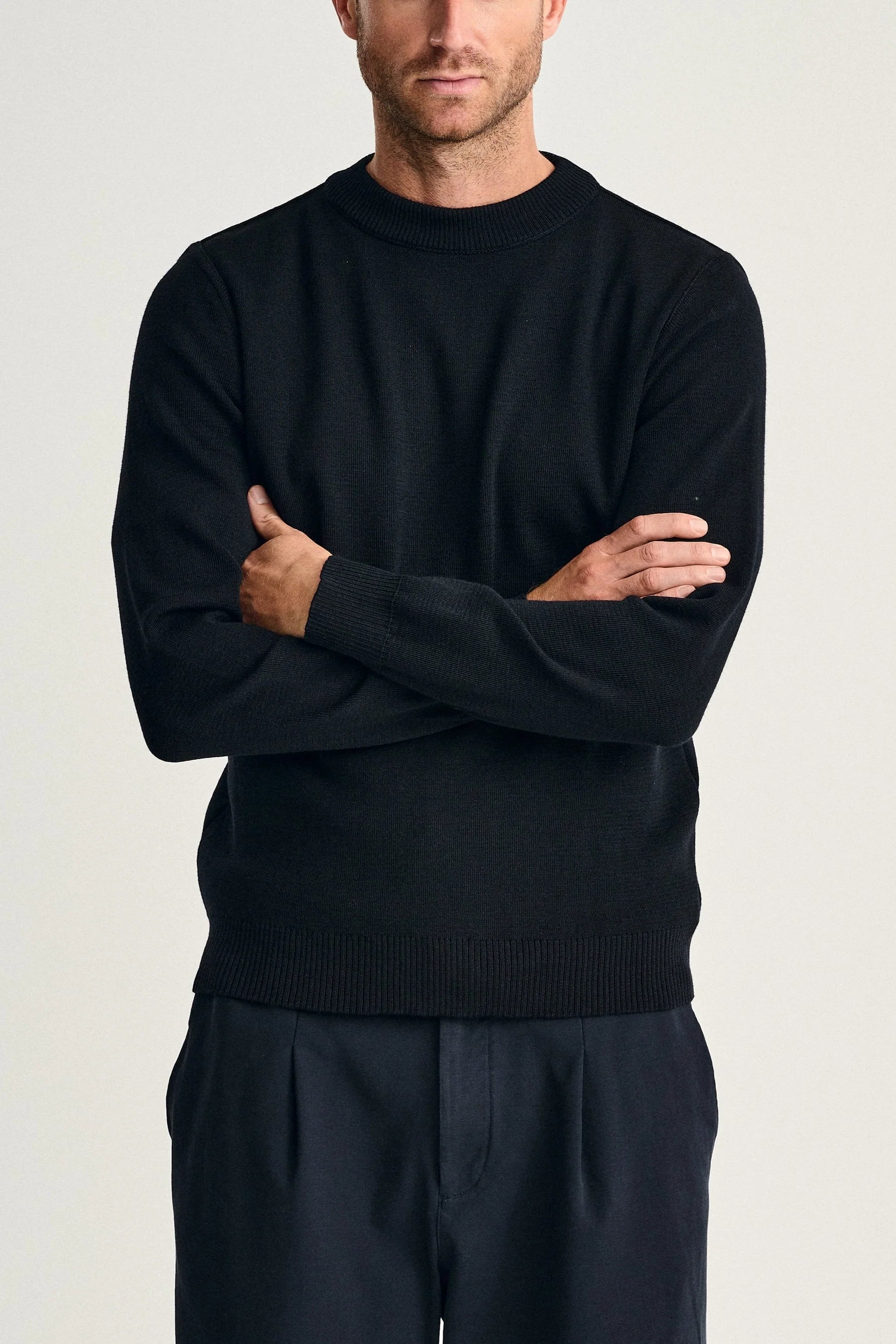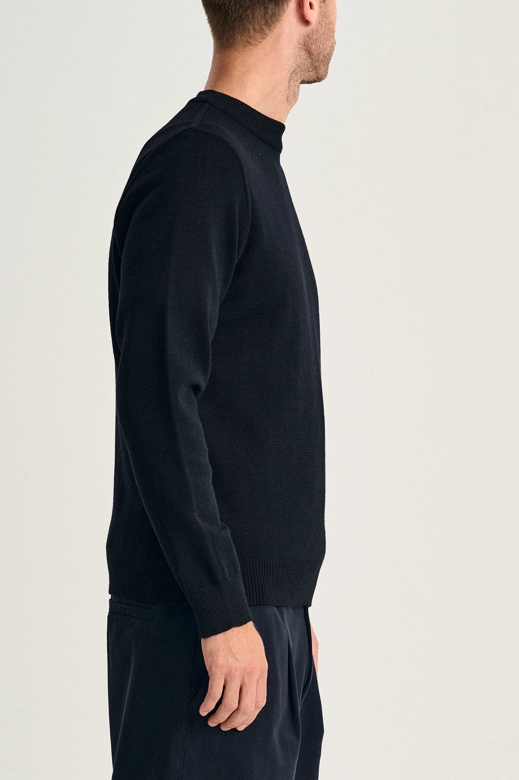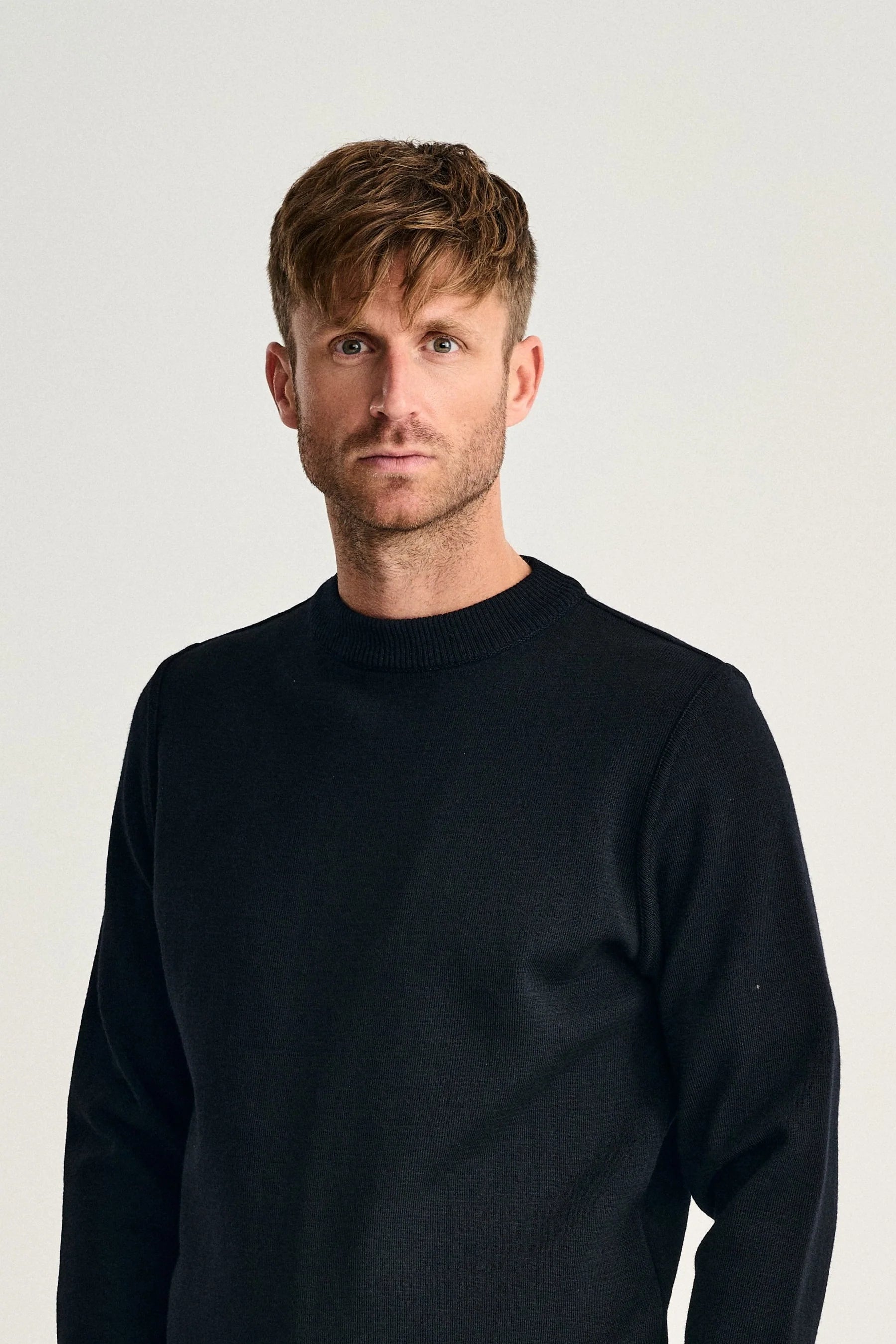 DESIGN | Marine III crew neck with precise collar. Set-in sleeves. Rib cuffs and hem. Elegant two-wool blend with subtle melange effect. |