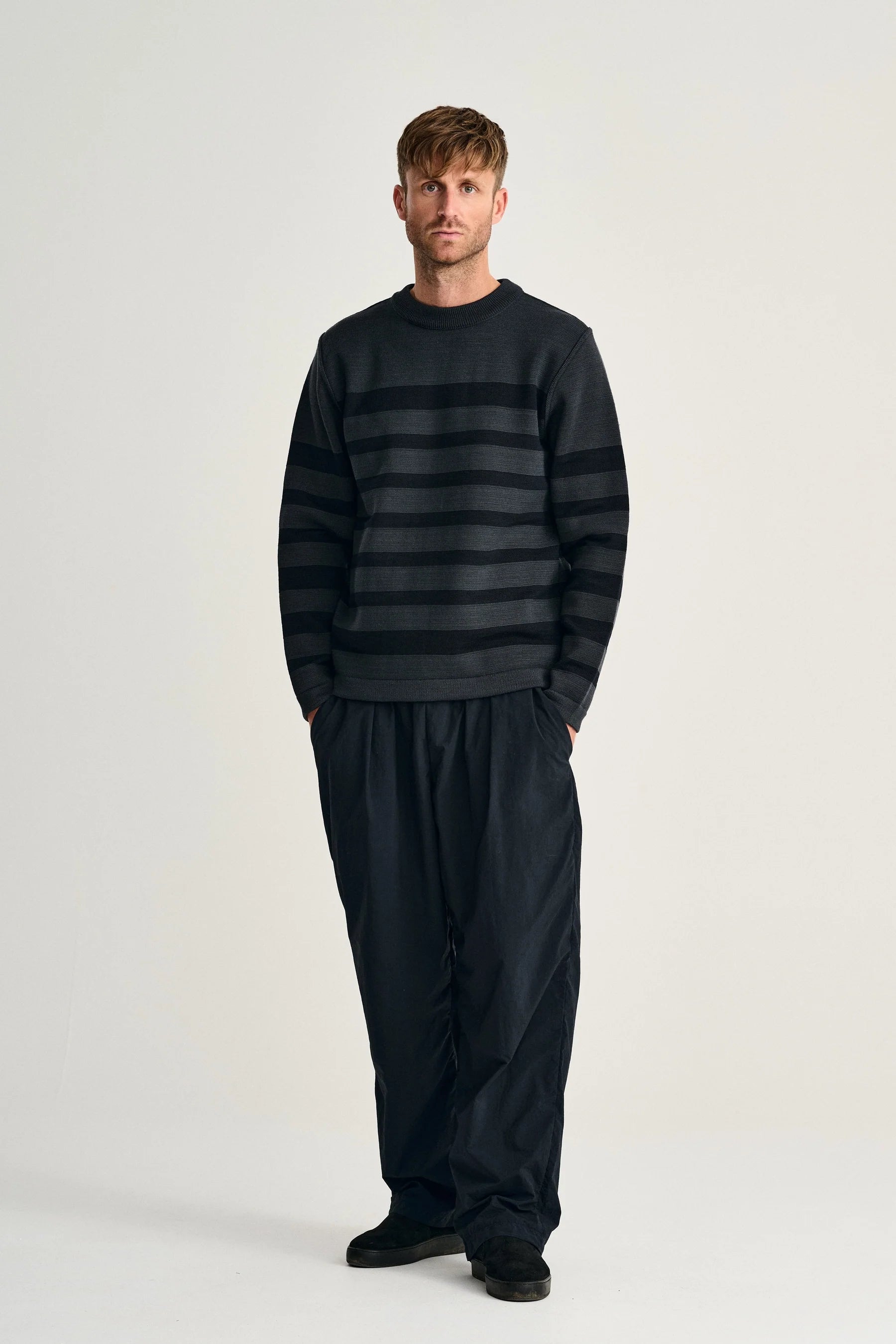 DESIGN | Heavily modified NAVAL crew neck. Enlarged stripes in a new layout. Rich surface texture from varied knit techniques. Heavy yet comfortable. |