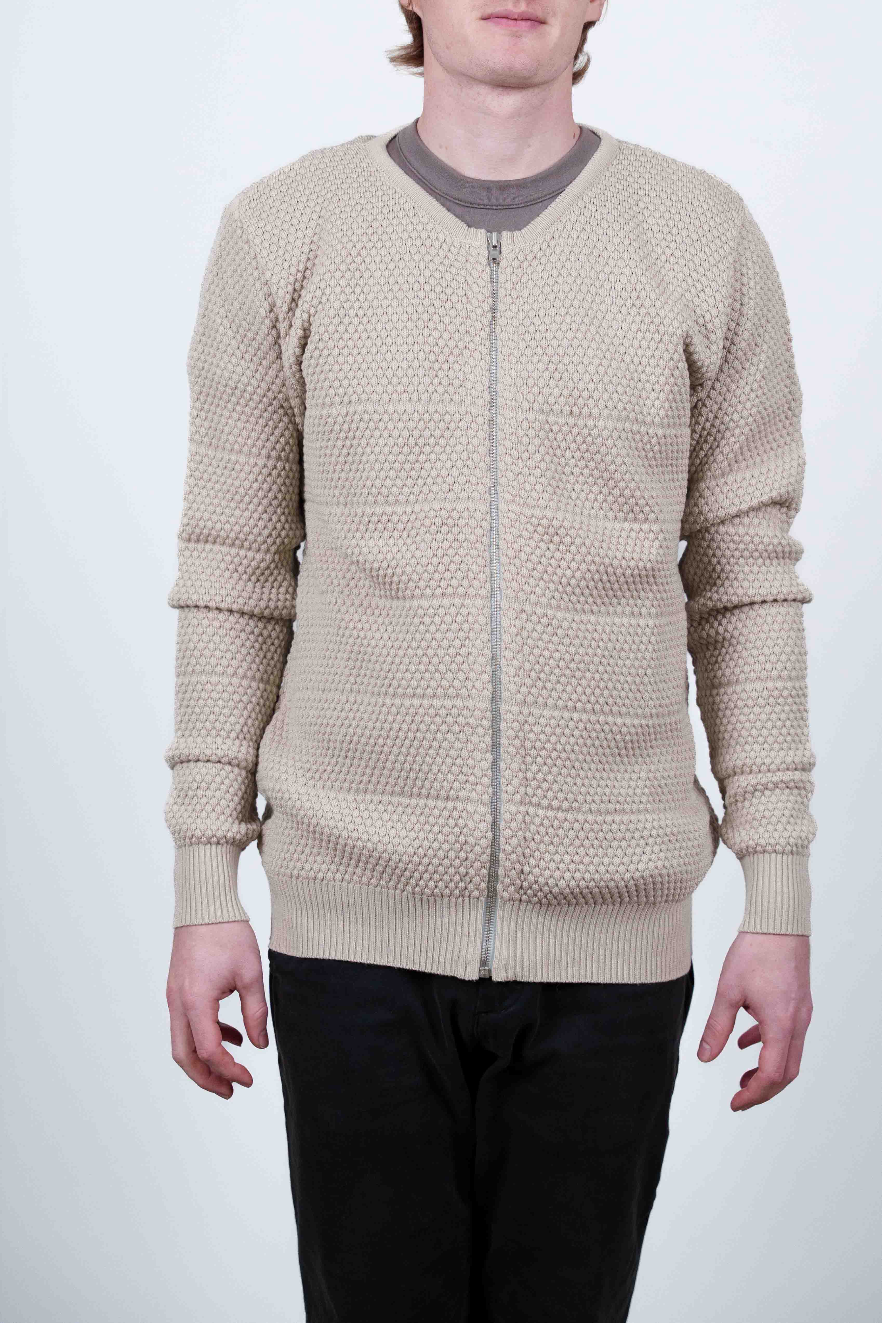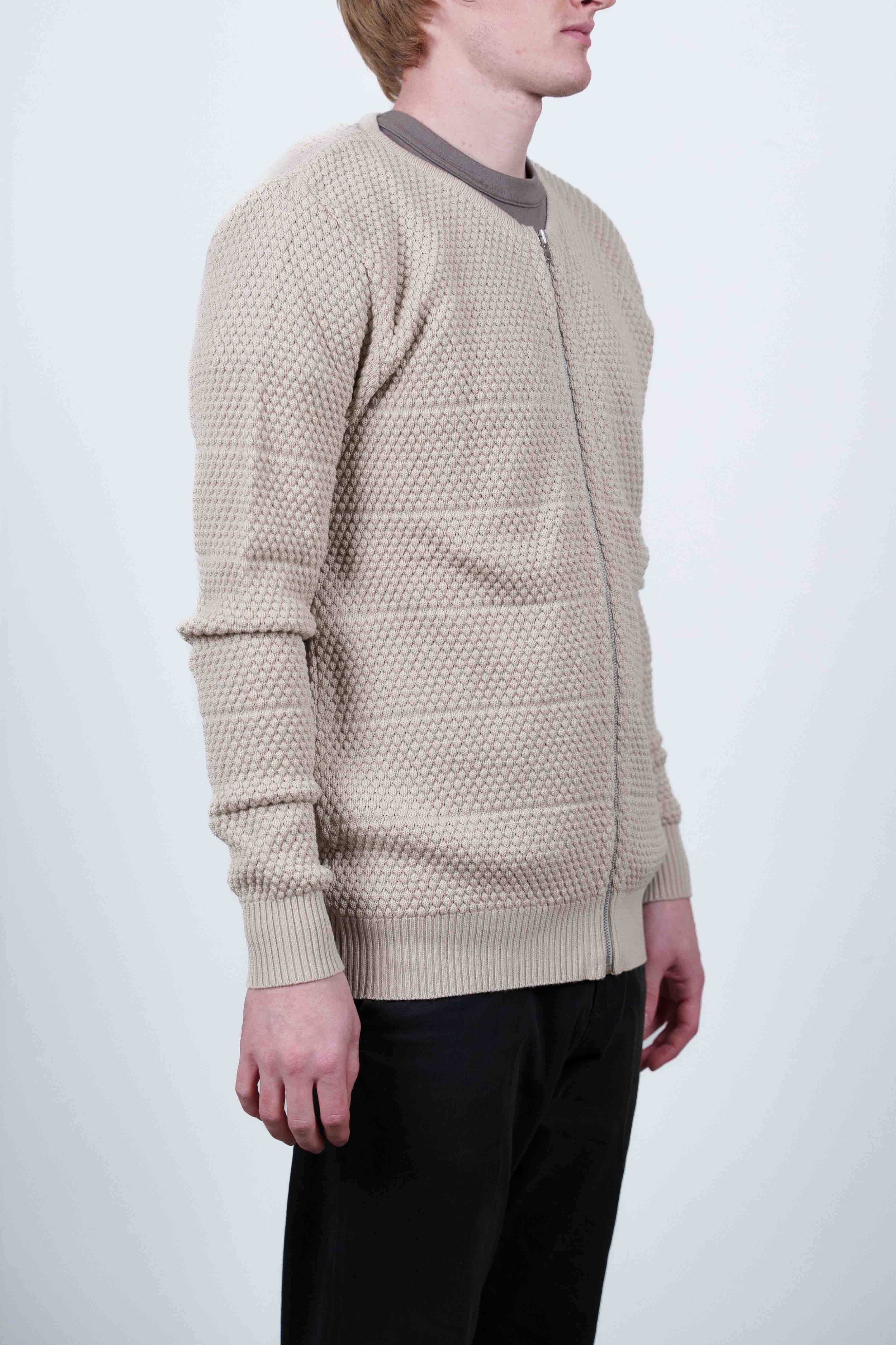Full-zip cardigan in a neutral beige from the SS18 collection, featuring a textured bubble knit pattern throughout.