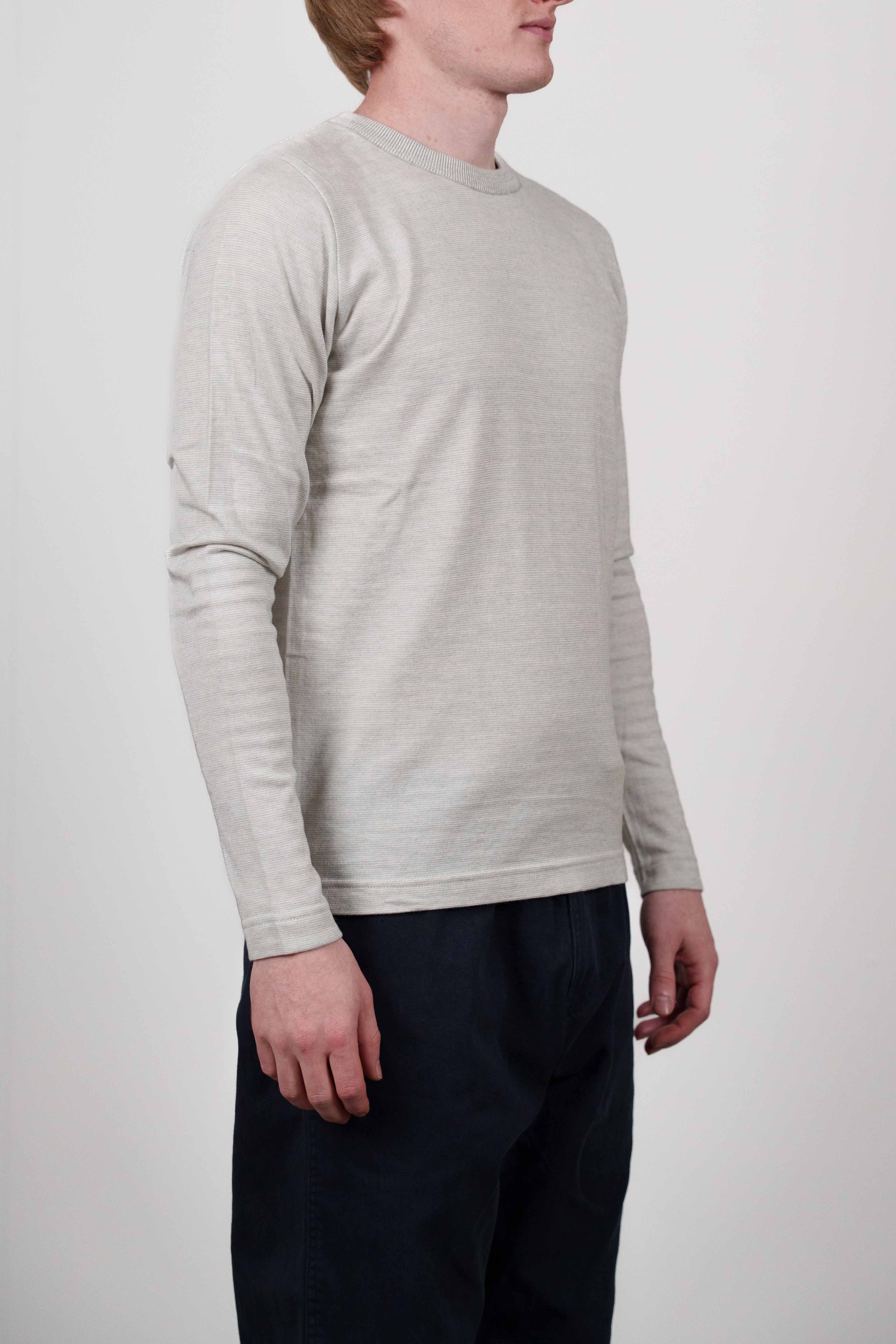 Light neutral crew neck sweater crafted from a fine, horizontally textured knit fabric, a key piece from the SS13 collection. Features ribbed collar, cuffs, and hem, with a lightweight yet structured feel that ensures a sharp silhouette.