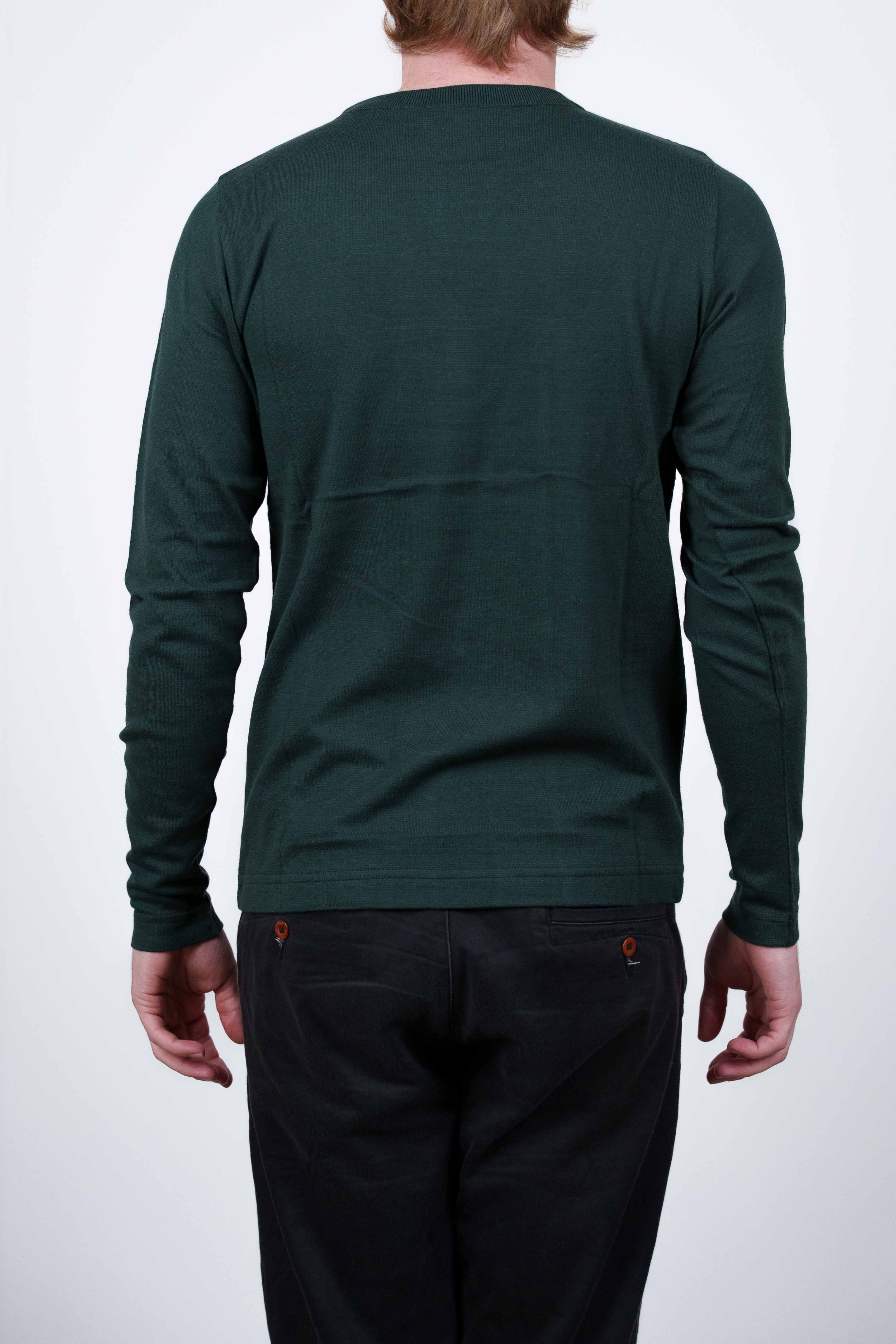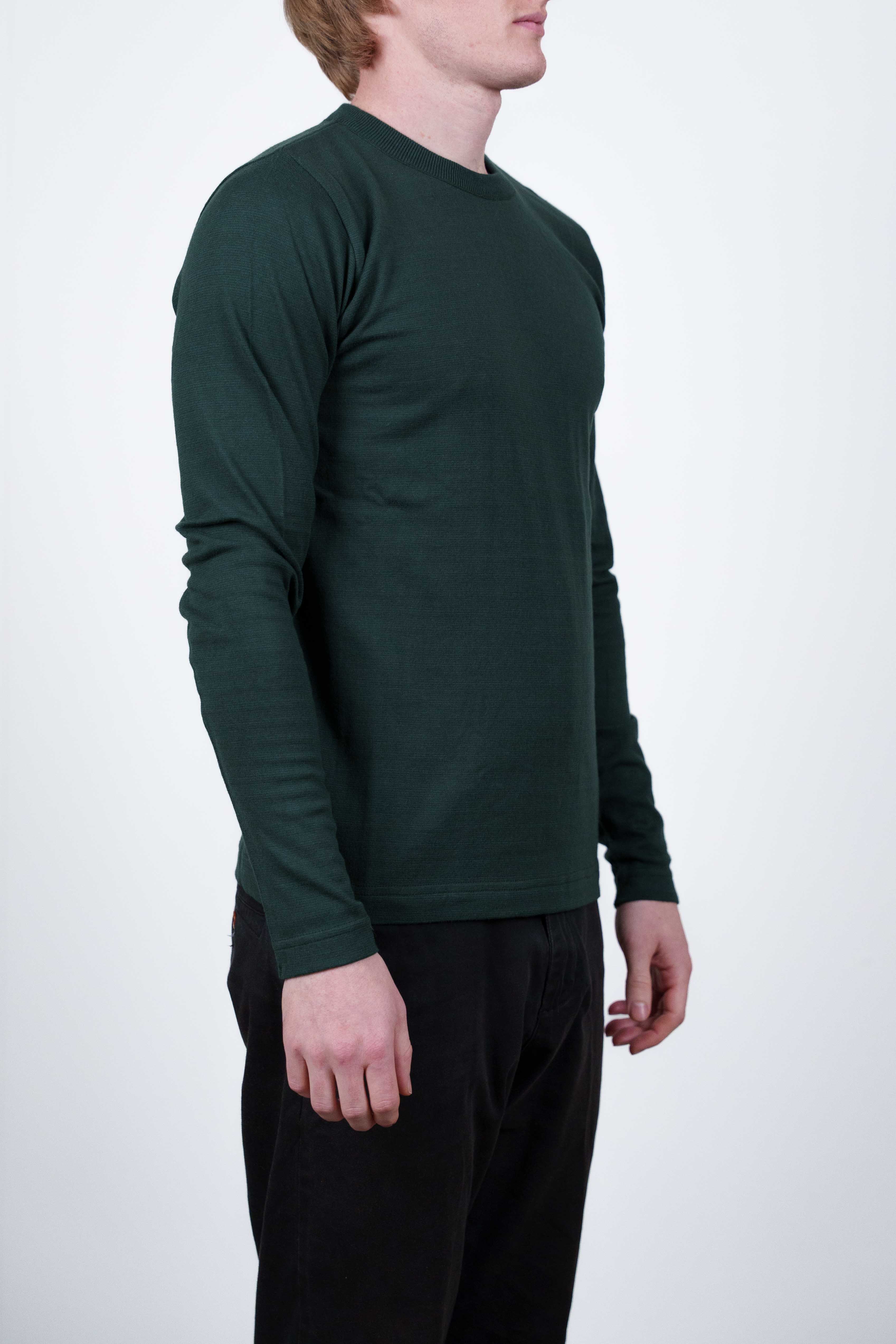 It features a ribbed neckline and a ribbed bottom hem, presenting a smooth, classic appearance perfect for layering.