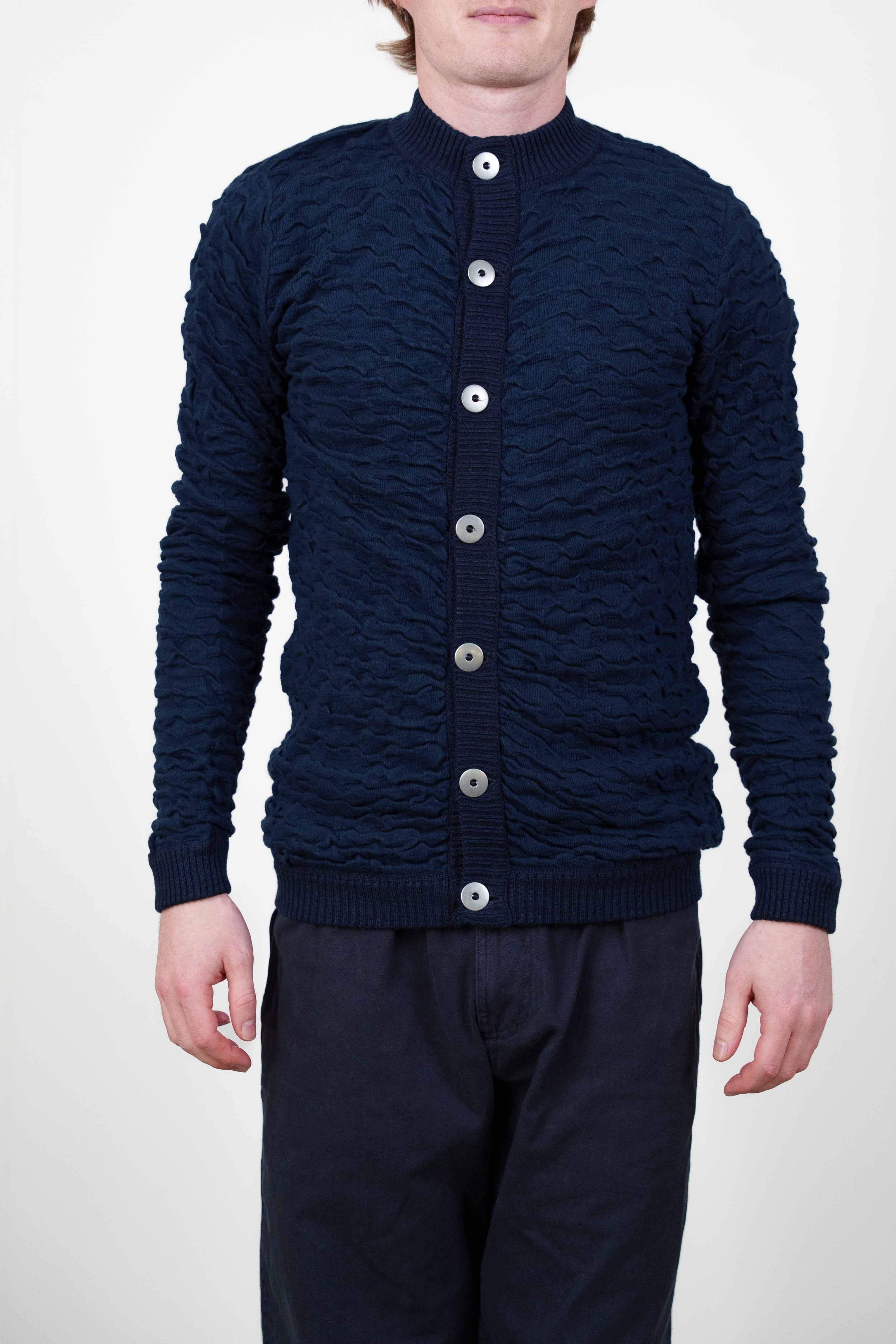 Navy blue knit cardigan from our SS14 collection, featuring a textured, rippled pattern throughout the body and sleeves.