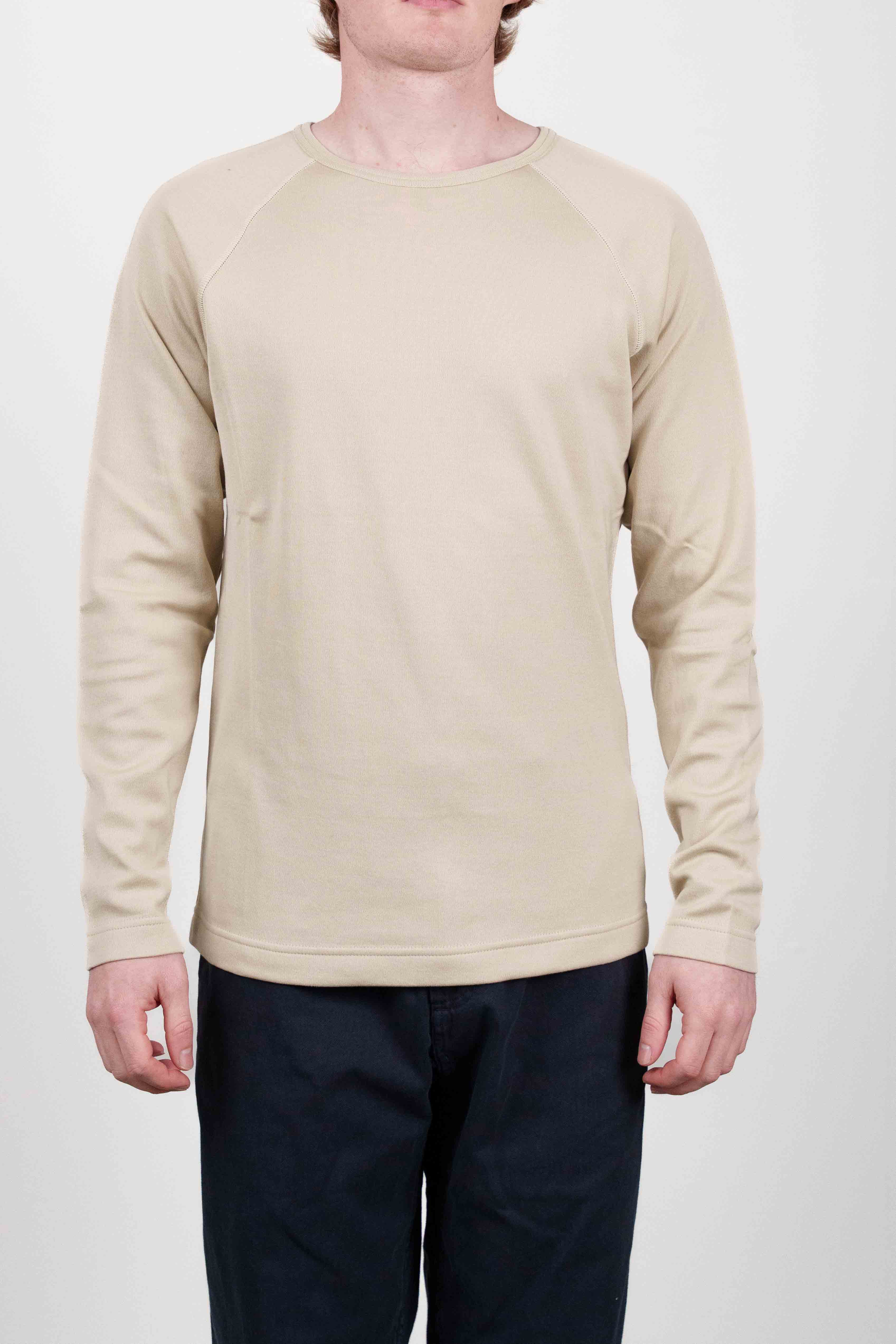 Neutral-coloured crew neck sweater from the SS18 collection, featuring raglan sleeves and a subtle, finely knitted texture. It has a relaxed fit with ribbed cuffs and hem and a comfortable medium-weight quality, perfect for layering.