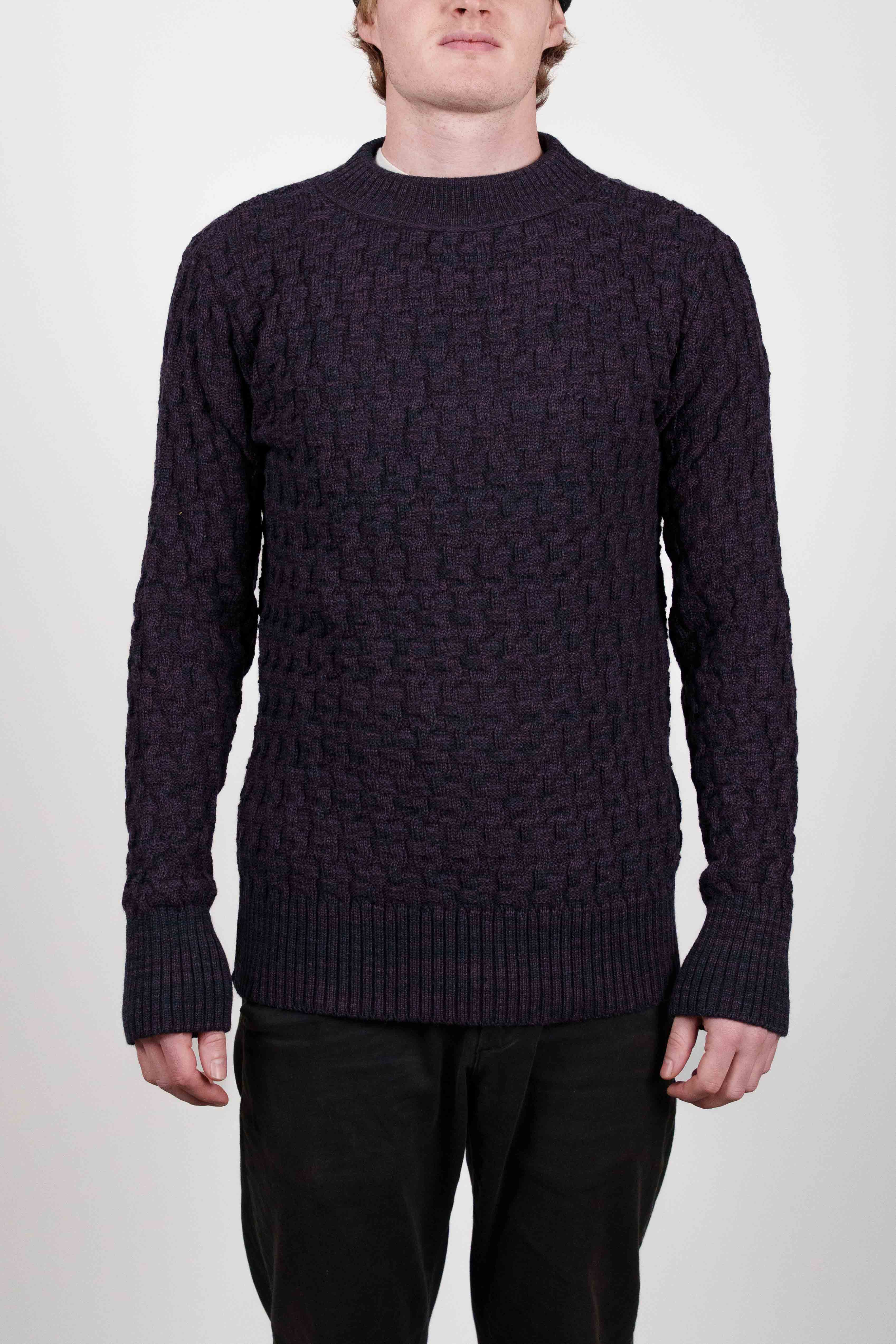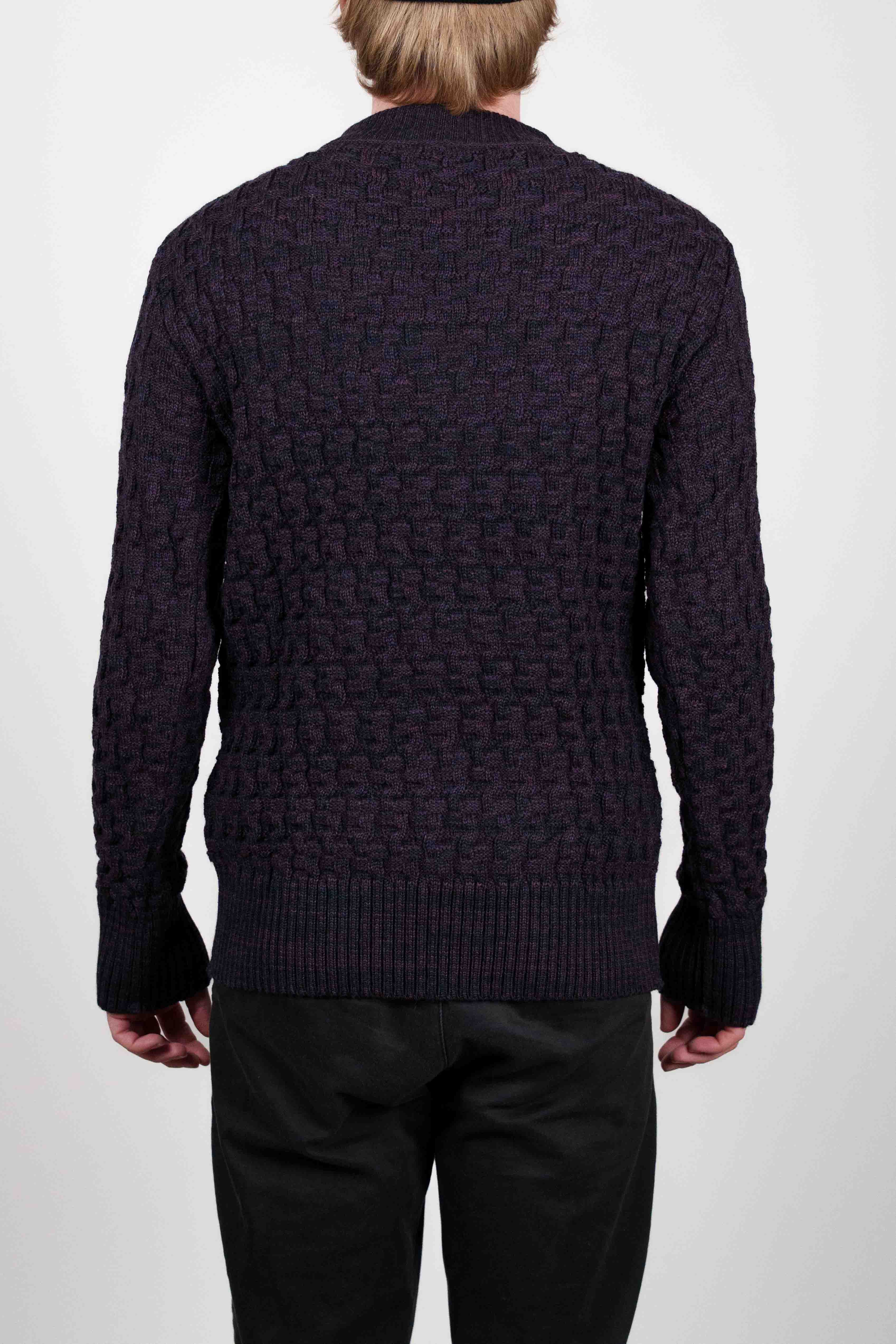 It features a prominent textured basketweave knit pattern across the body and sleeves, with ribbed cuffs, hem, and collar.