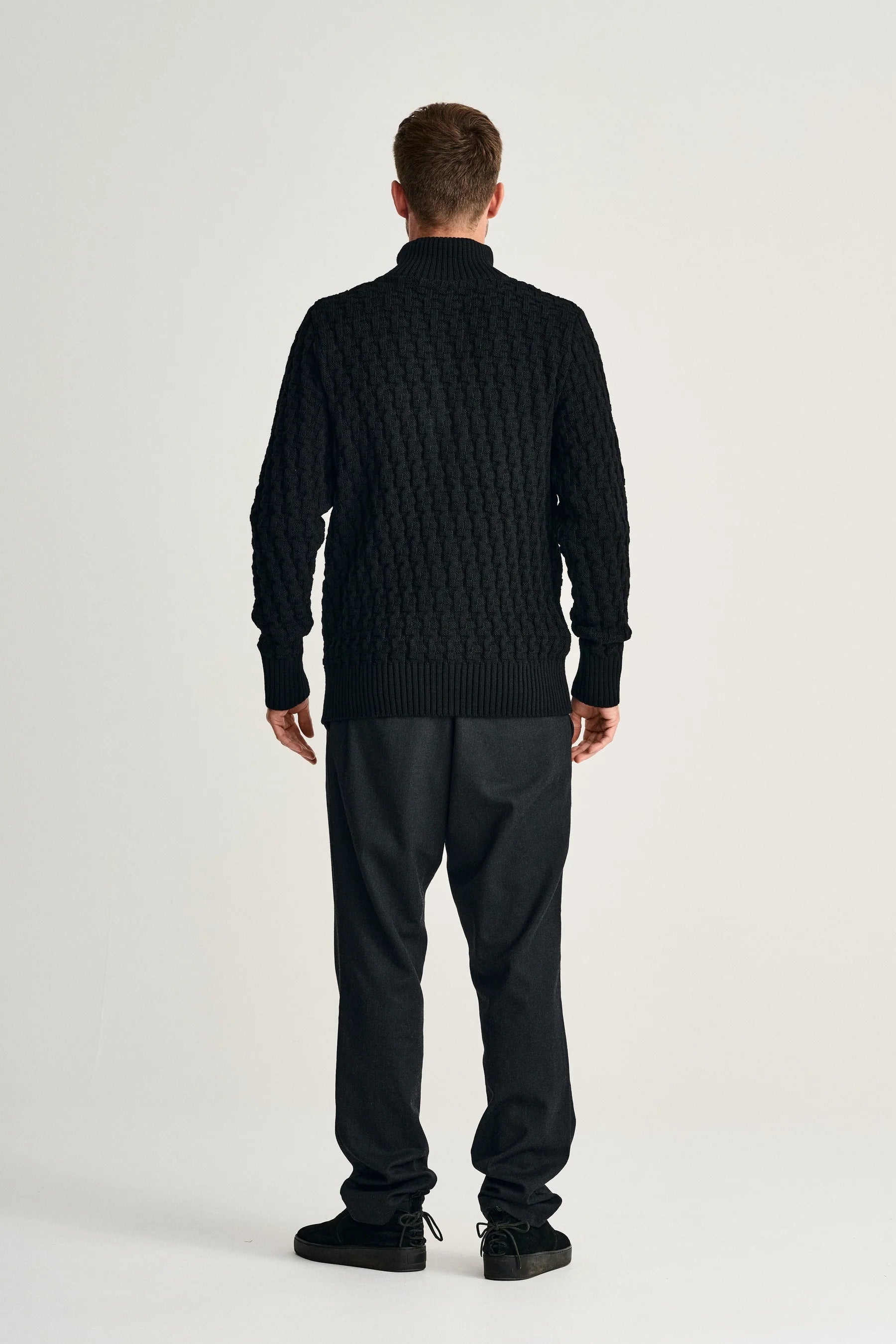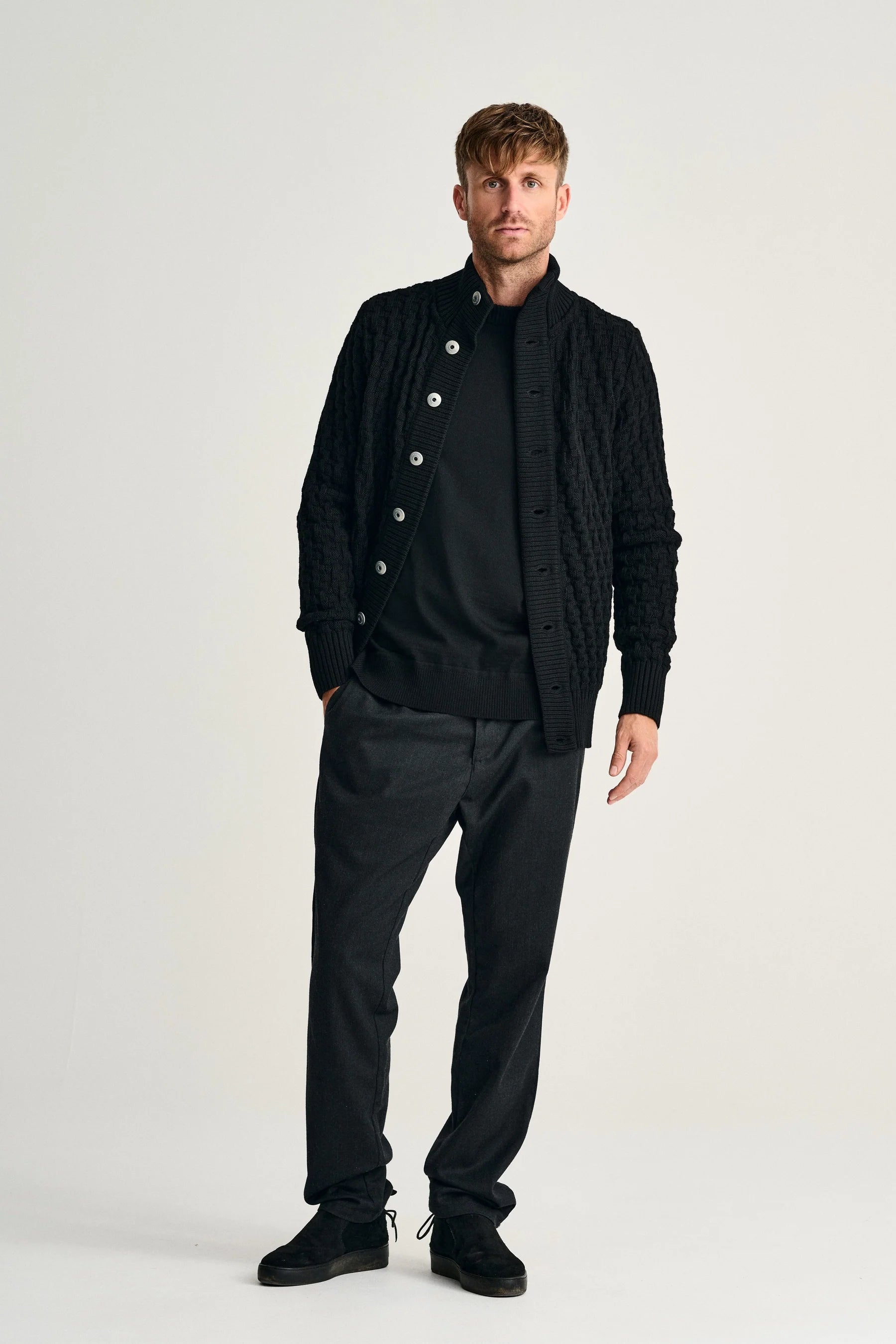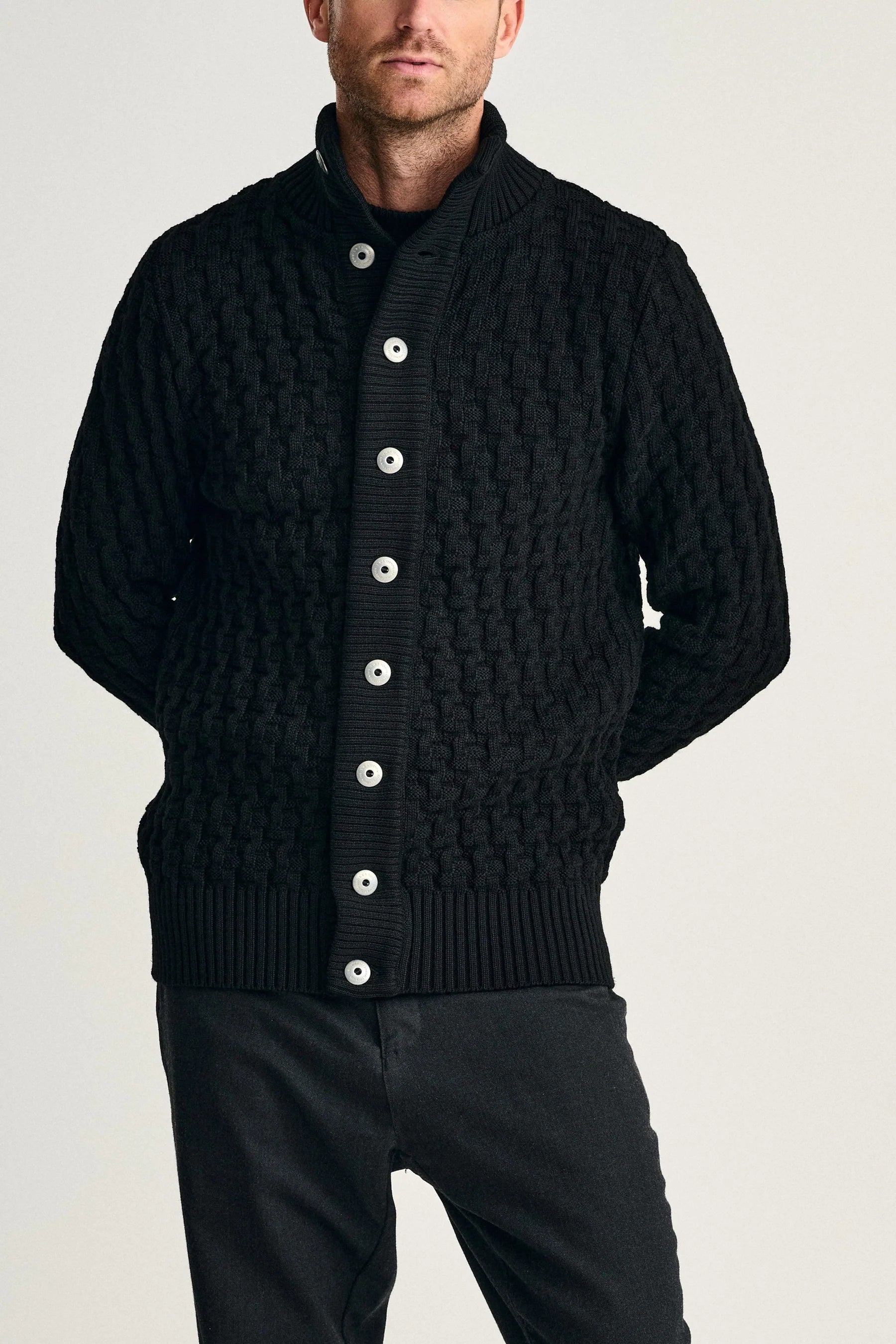 TECHNICAL DESCRIPTION | The cuffs are a single-layer 2x1 rib. The hem is a single-layer 2x1 rib, knitted in. The collar is a two-layer fixated 2x1 rib. The band is a two-layer fixated 2x1 rib with a tubular neck band. The garment closes with nine embossed metal buttons. |