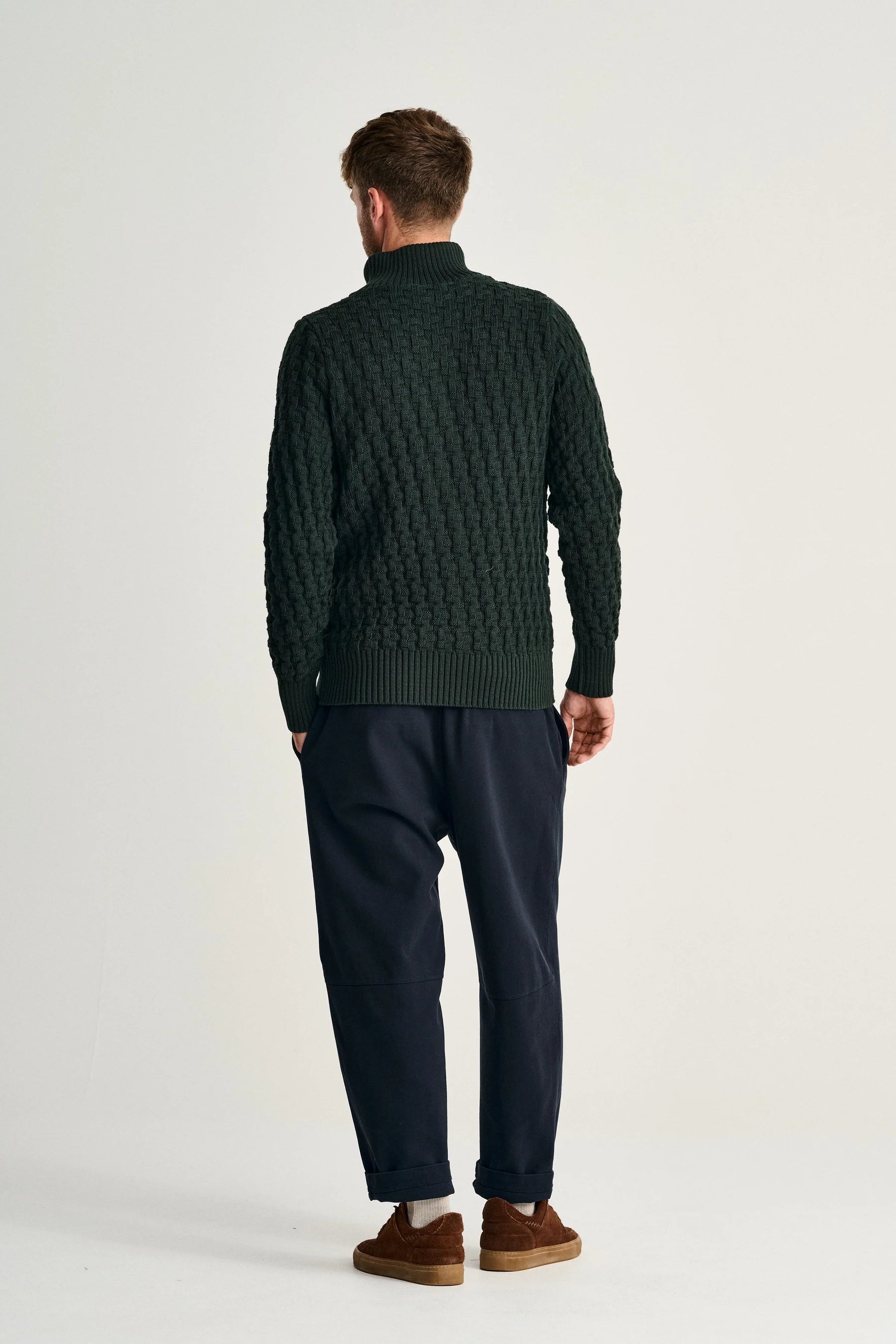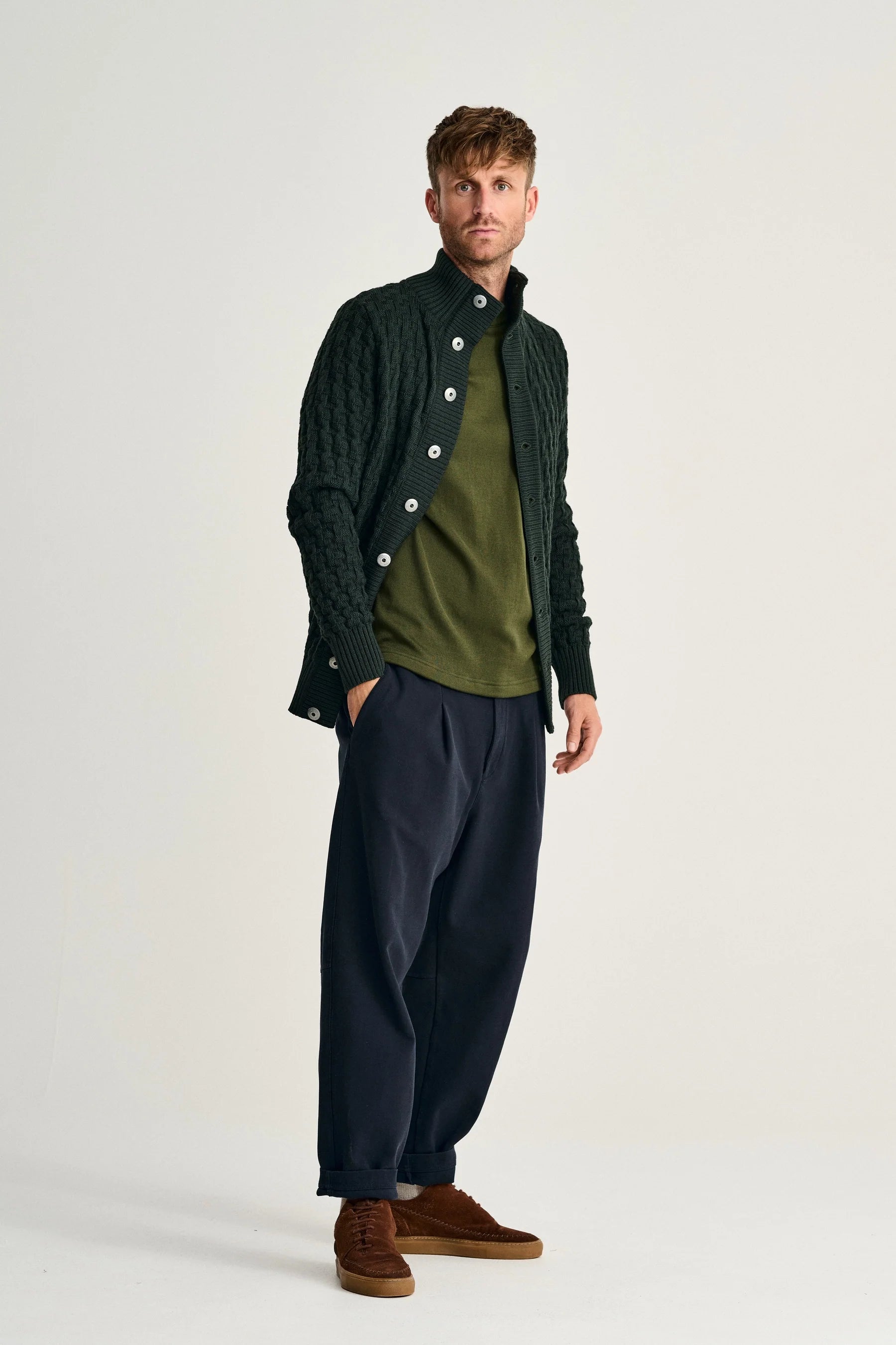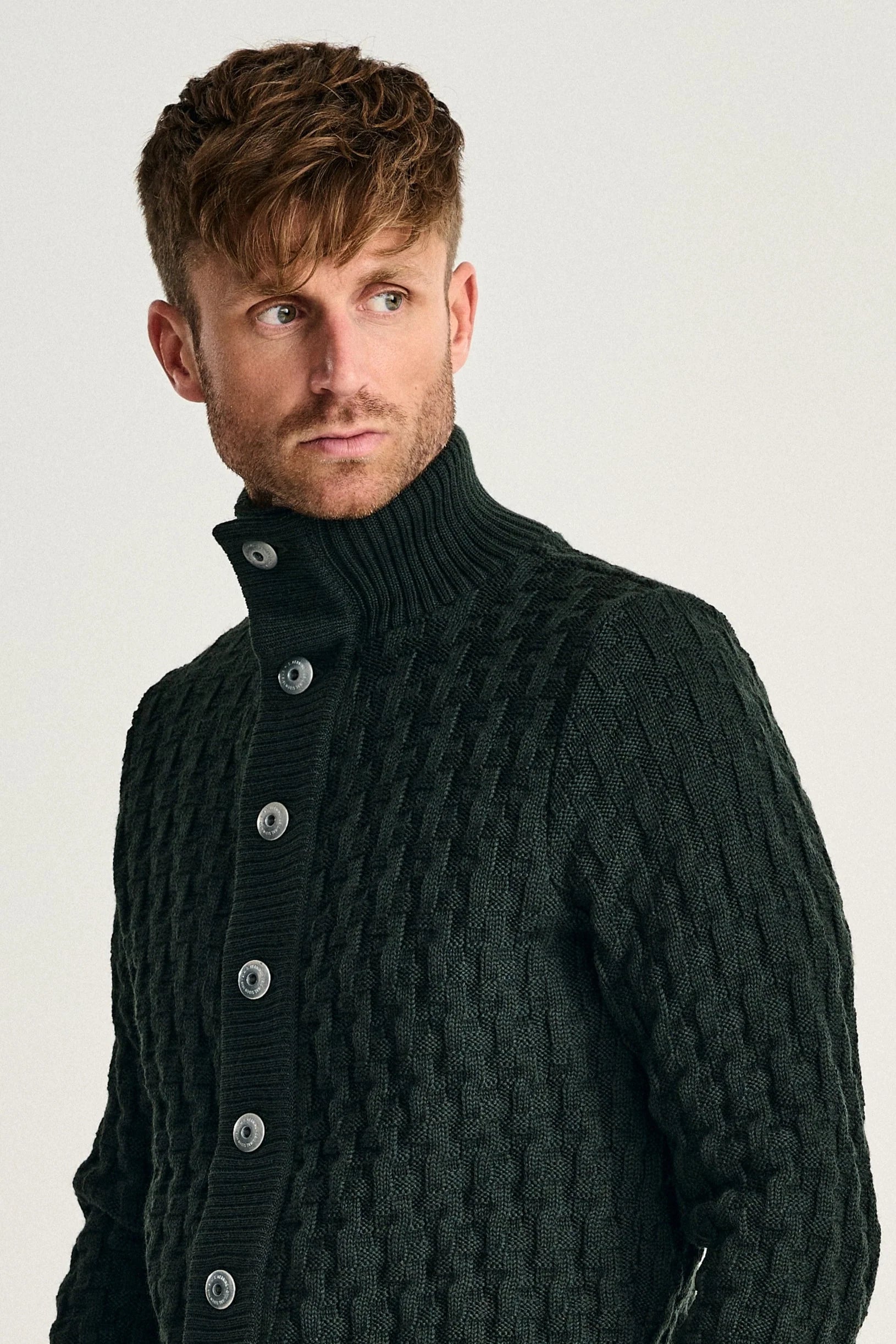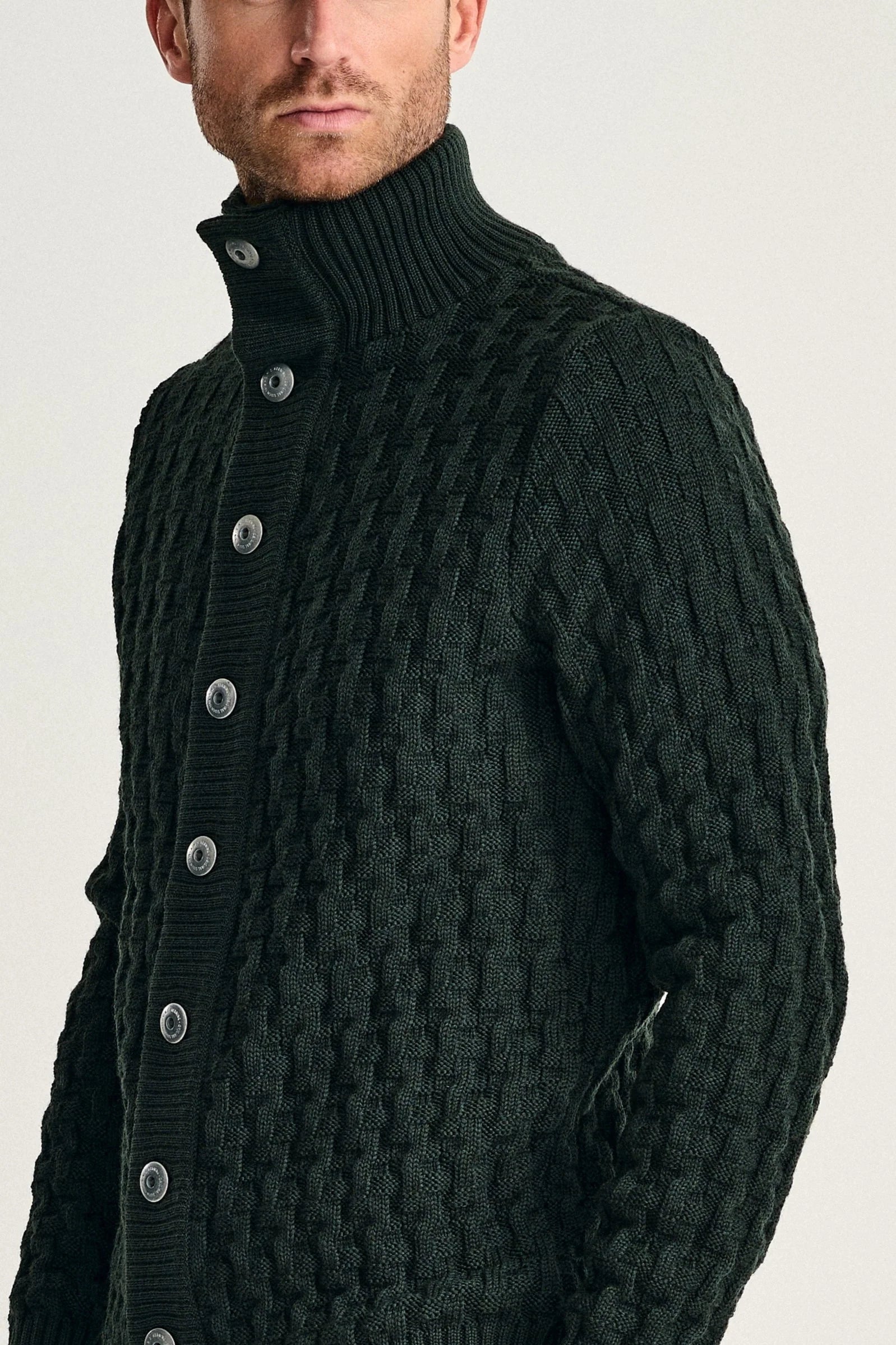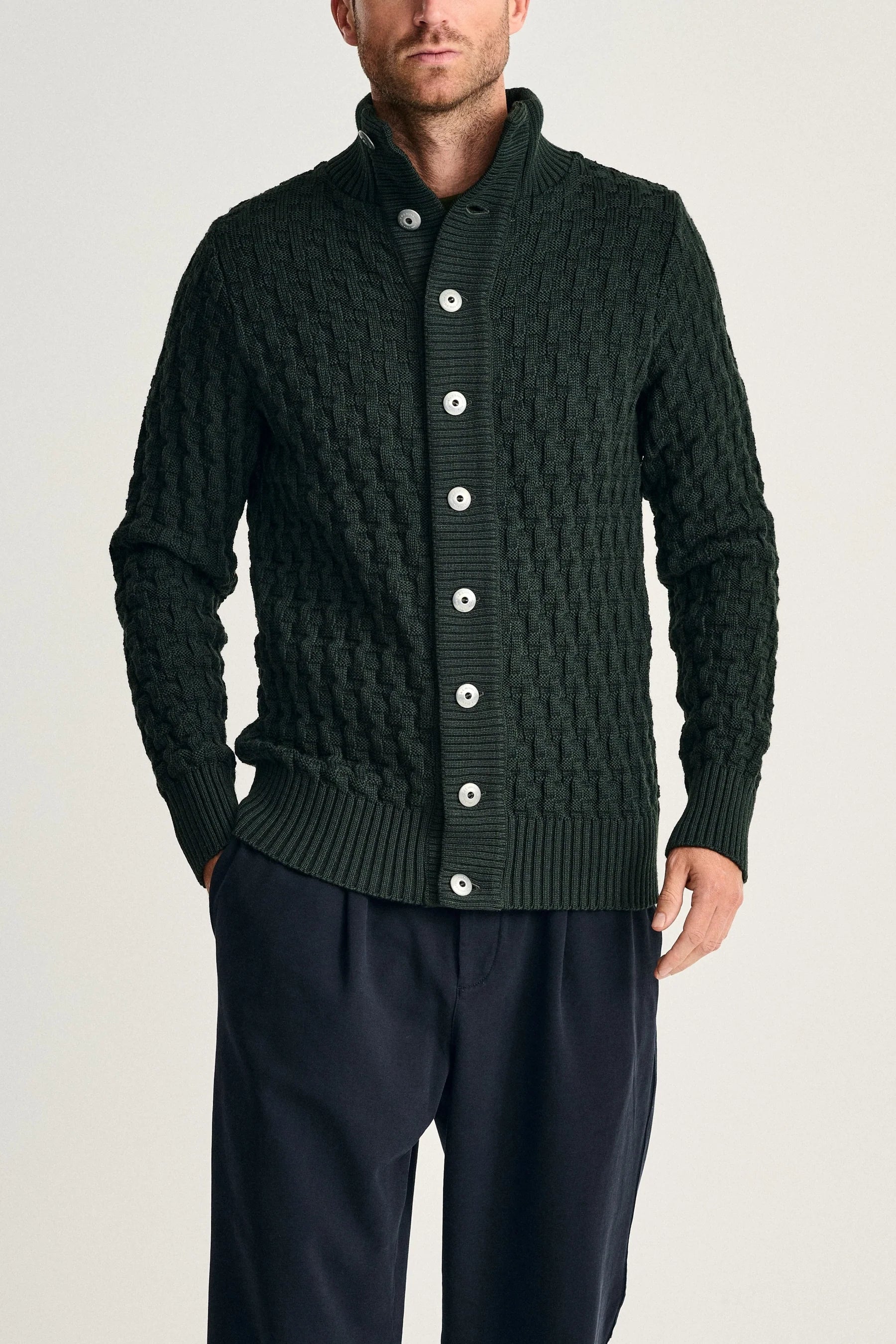 TECHNICAL DESCRIPTION | The cuffs are a single-layer 2x1 rib. The hem is a single-layer 2x1 rib, knitted in. The collar is a two-layer fixated 2x1 rib. The band is a two-layer fixated 2x1 rib with a tubular neck band. The garment closes with nine embossed metal buttons. |