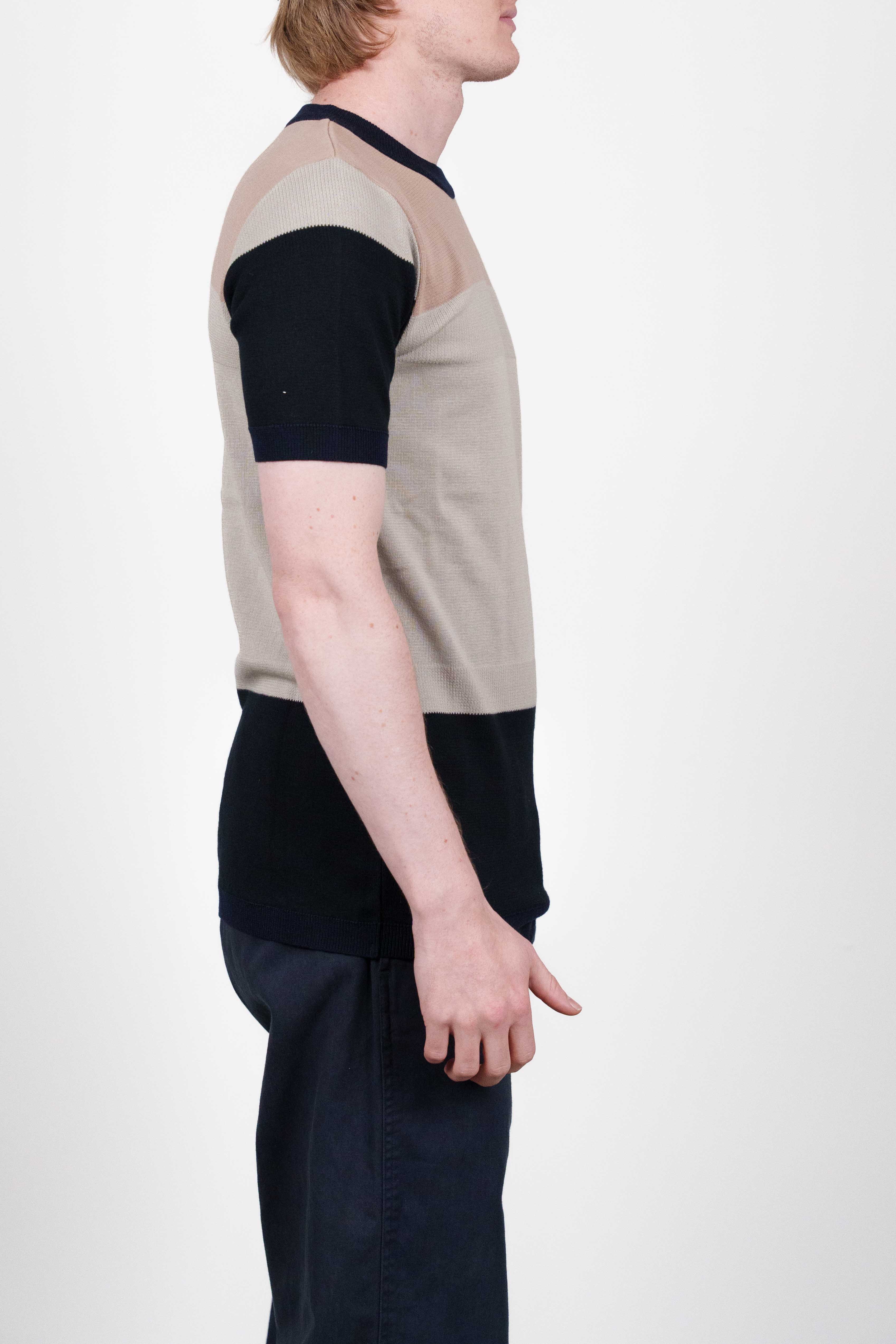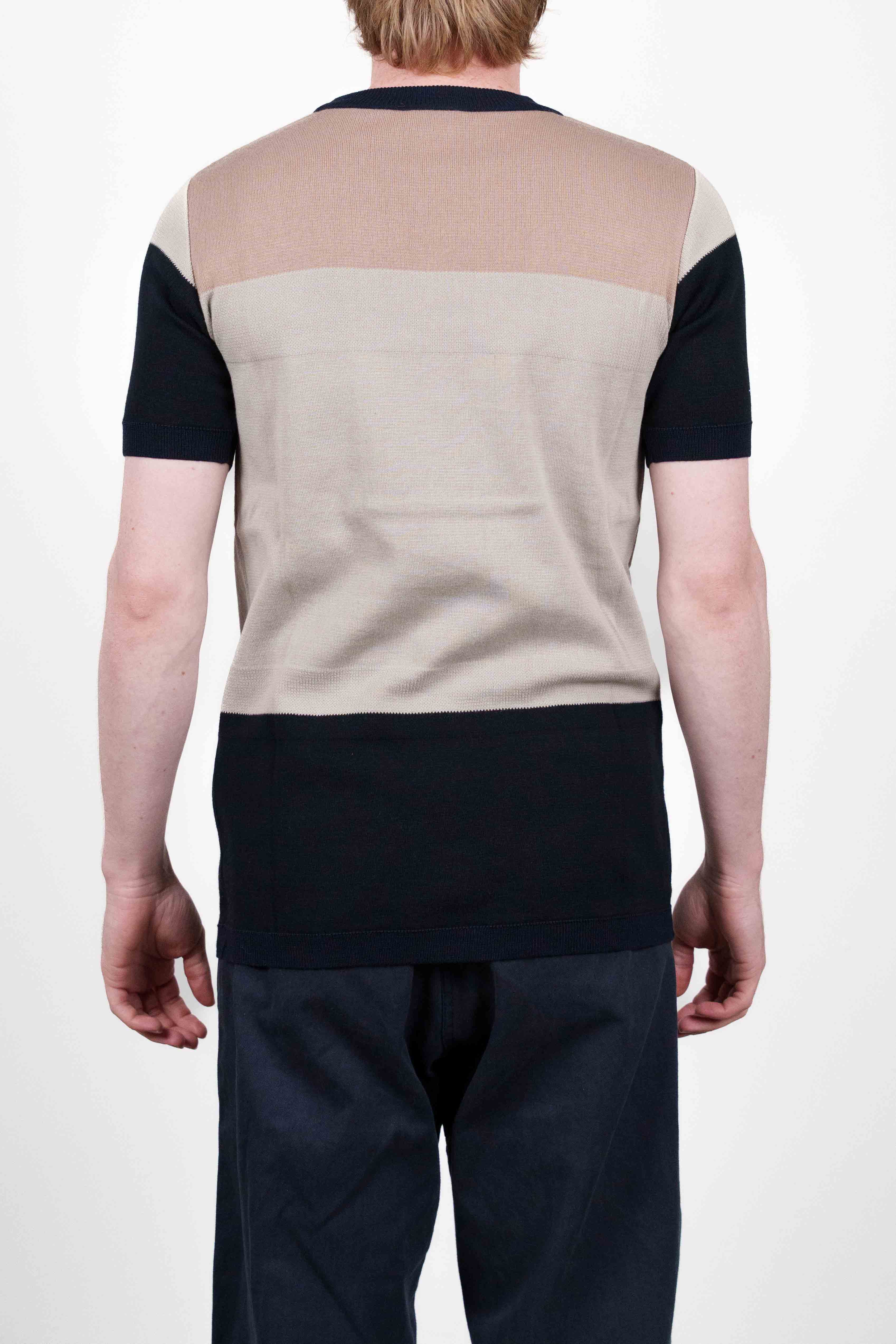Crew neck, short-sleeved sweater from the SS14 collection with a color block design. It features wide horizontal stripes in light brown / beige, and dark navy knit fabric, finished with ribbed collar, cuffs, and hem.