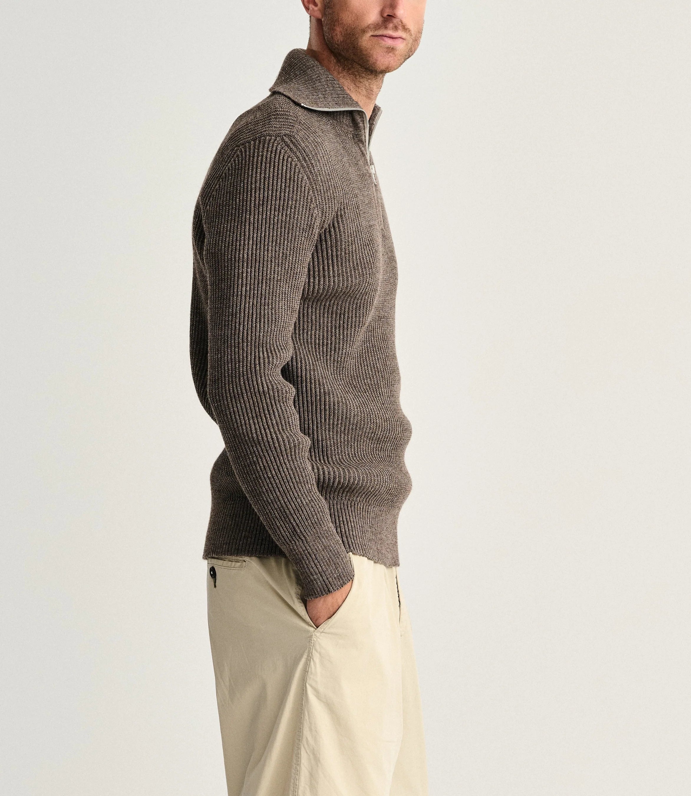 | DESIGN | Civil Defense-inspired knit updated with fully-fashioned construction and slightly elevated shoulder. Plated merino over virgin wool for strength and shape retention. Short front zipper. |