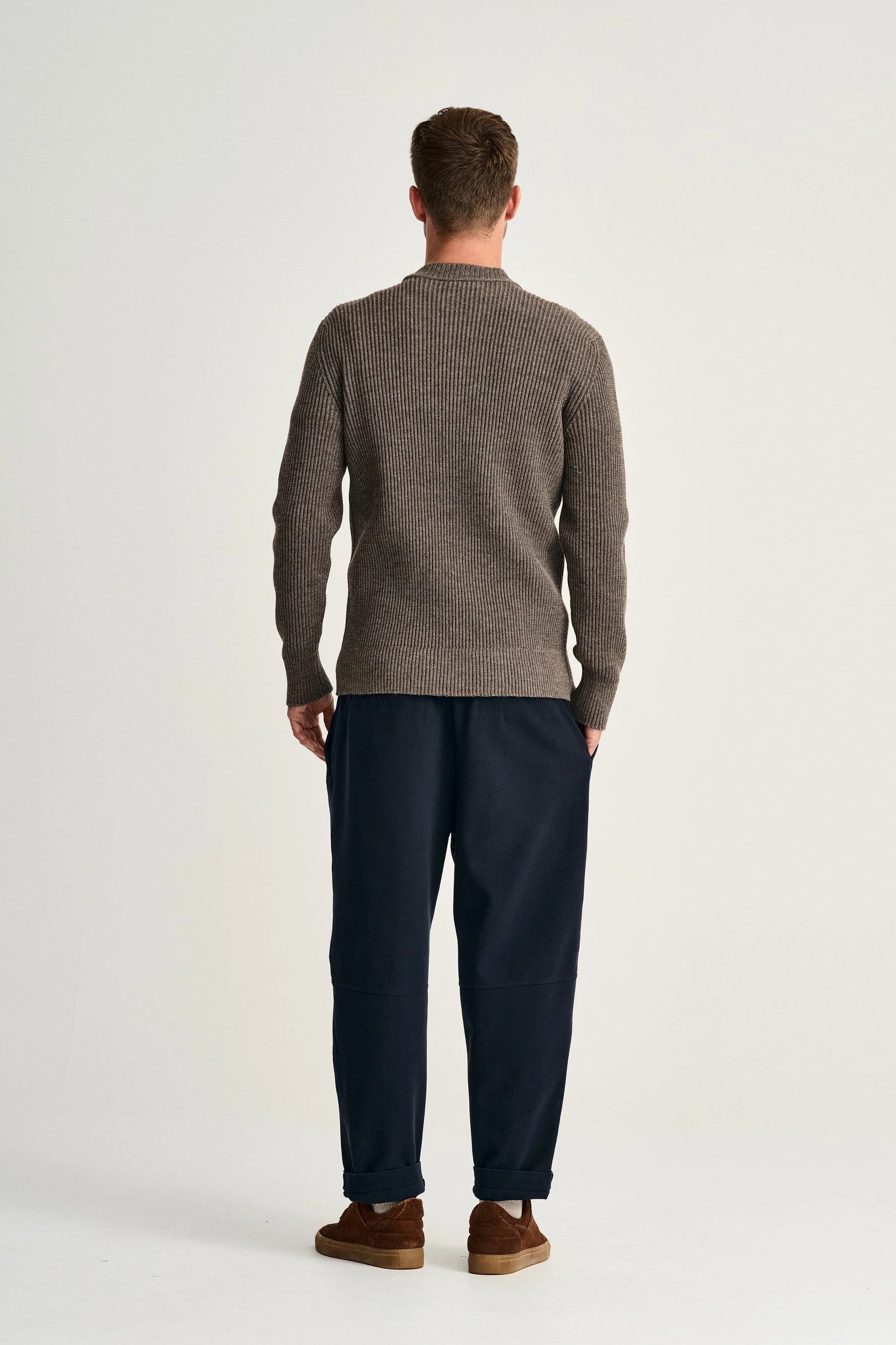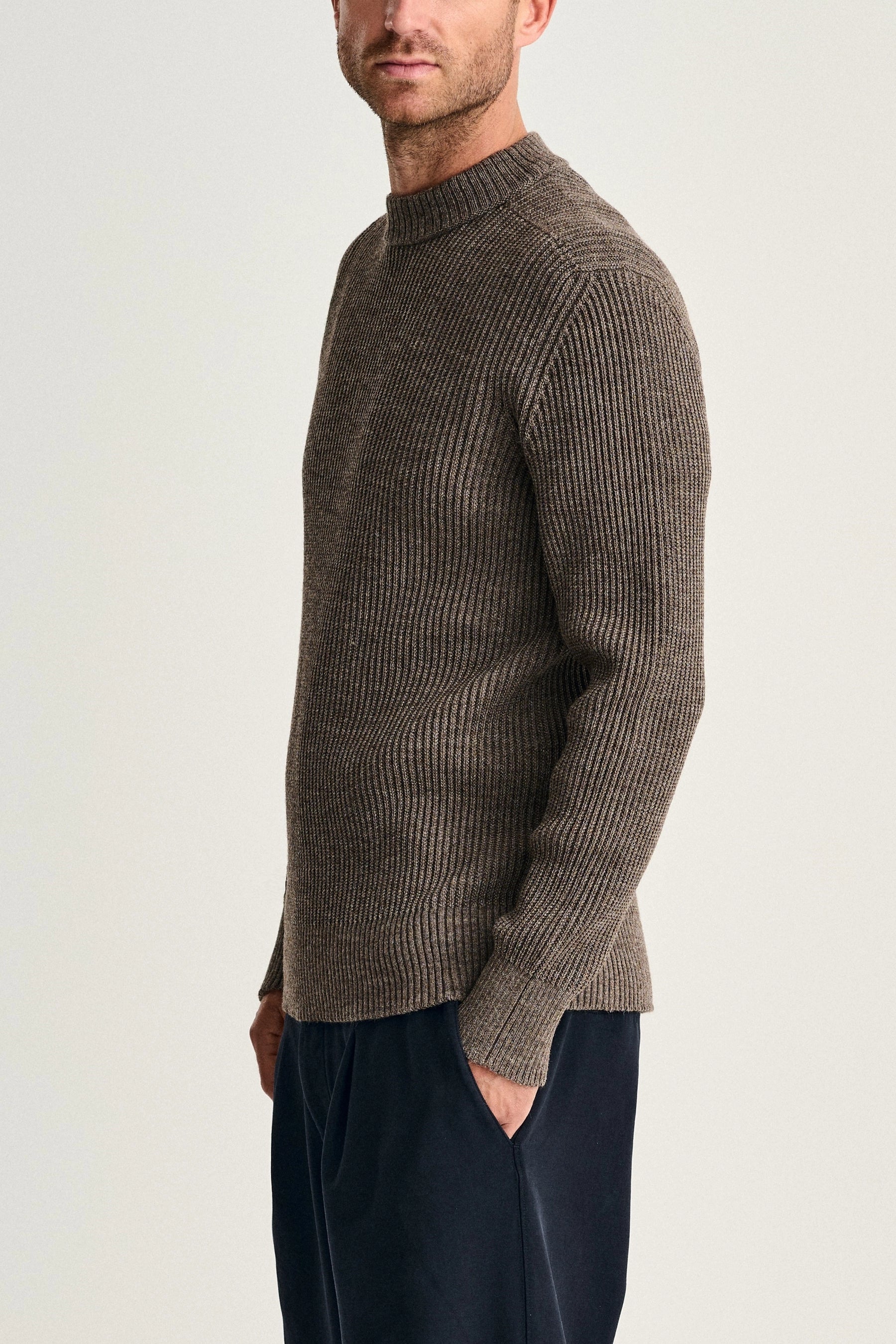 DESIGN | Civil Defense-inspired crew updated with fully-fashioned construction and slightly elevated shoulder. Plated merino over virgin wool for strength and shape retention. |