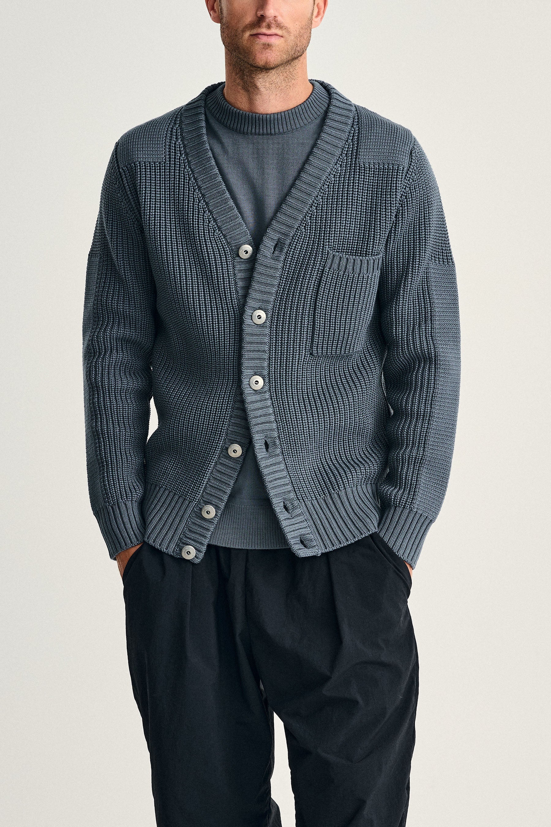 | DESIGN | Robust cardigan referencing 1970s Danish Civil Defense knits. Technical knitted-in shoulder and elbow fabric. Heavy yet refined with embossed signature buttons and front knitted-in pocket. |