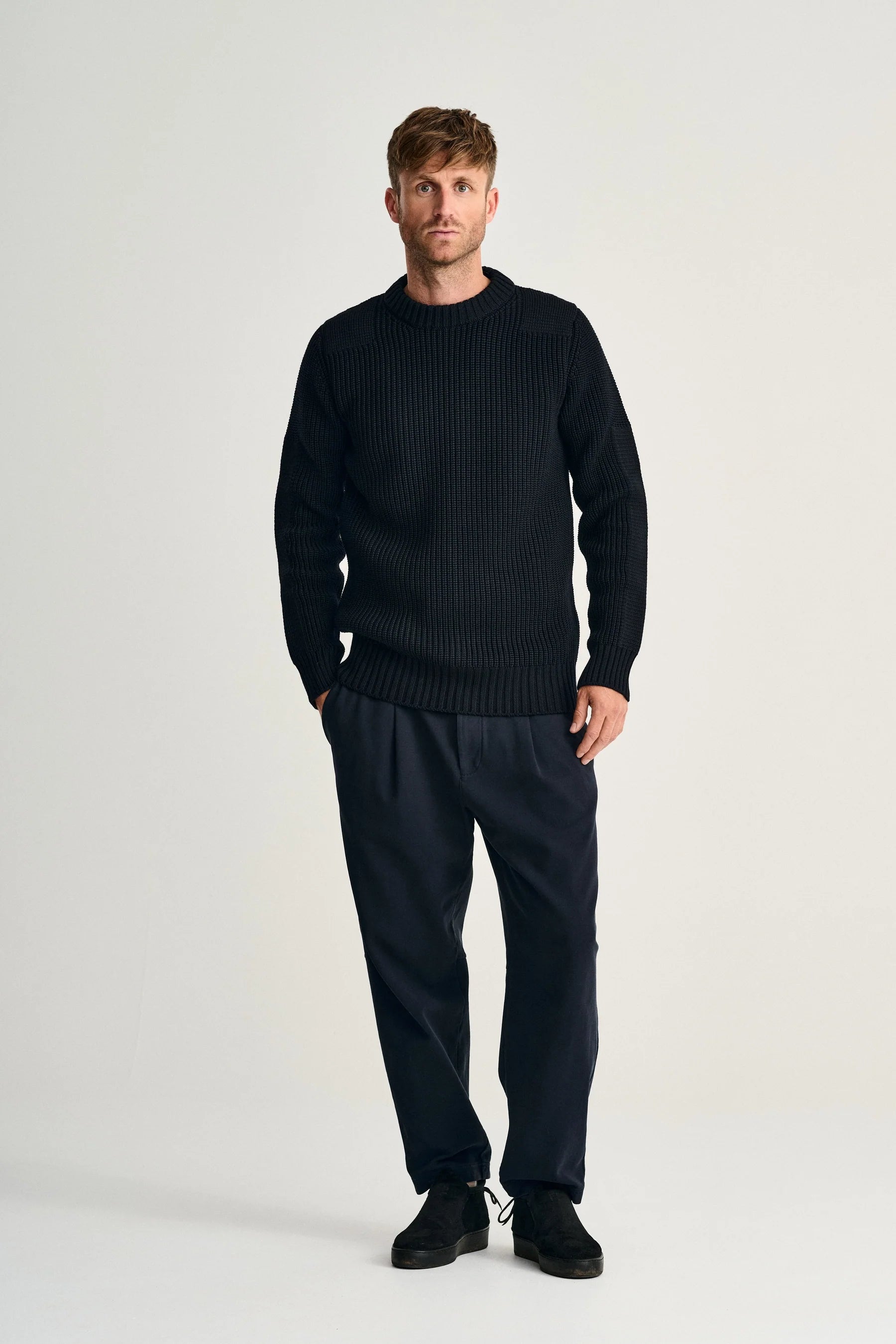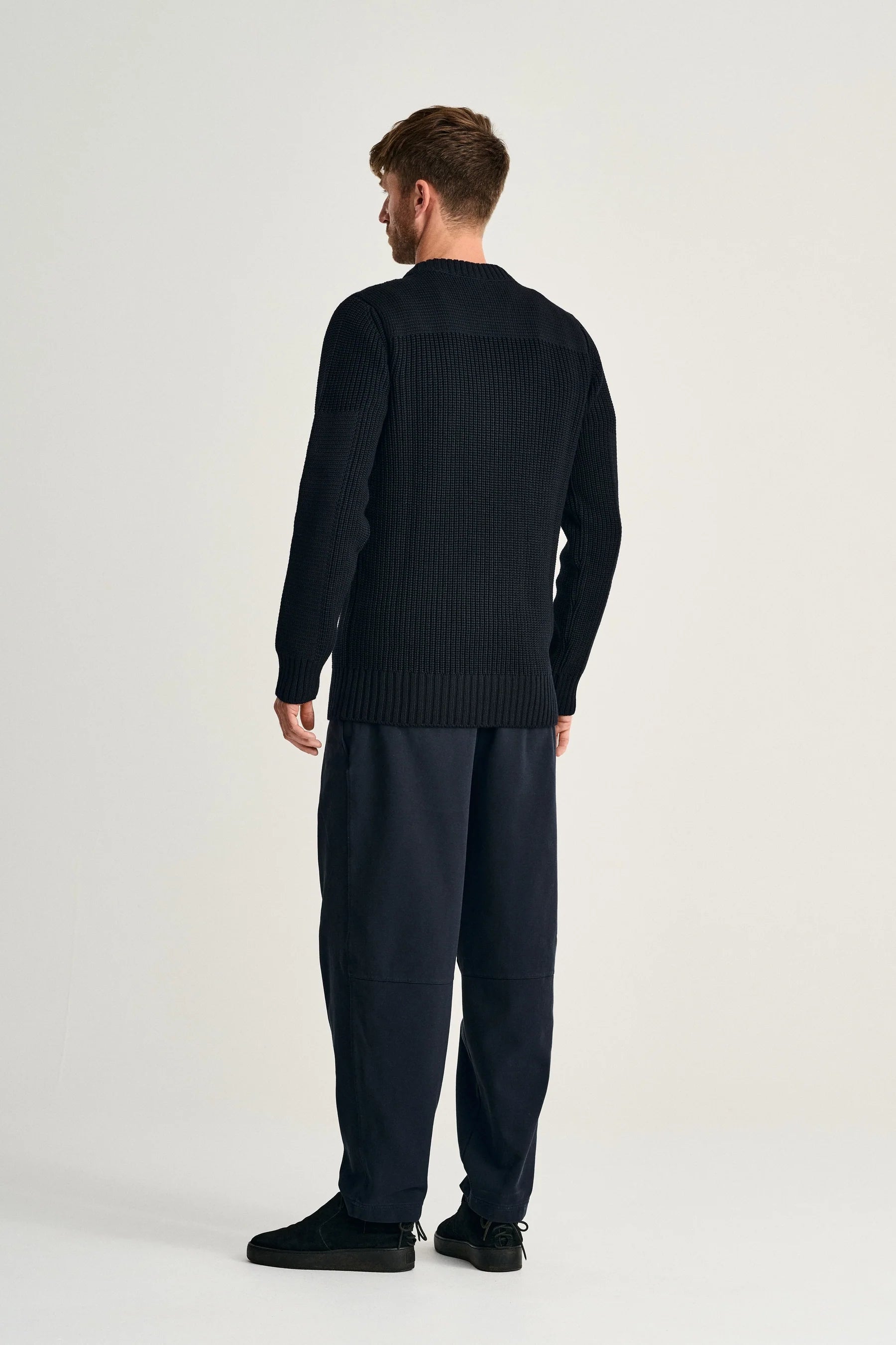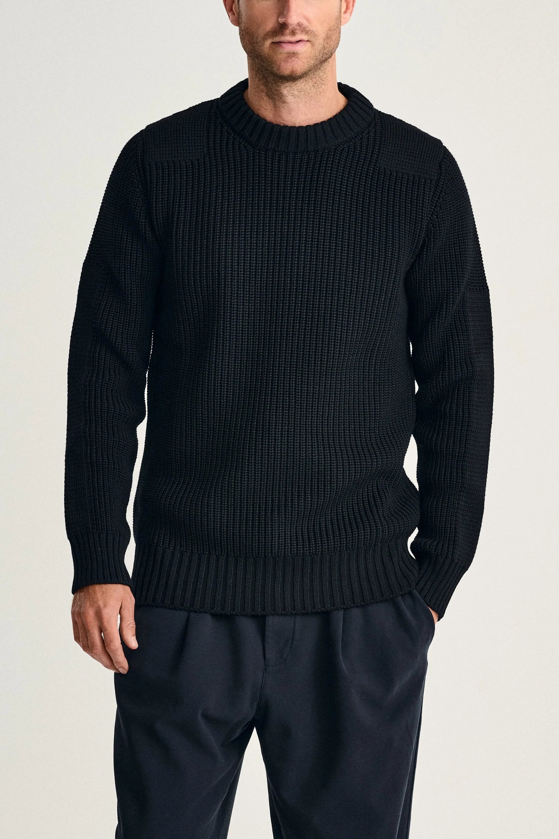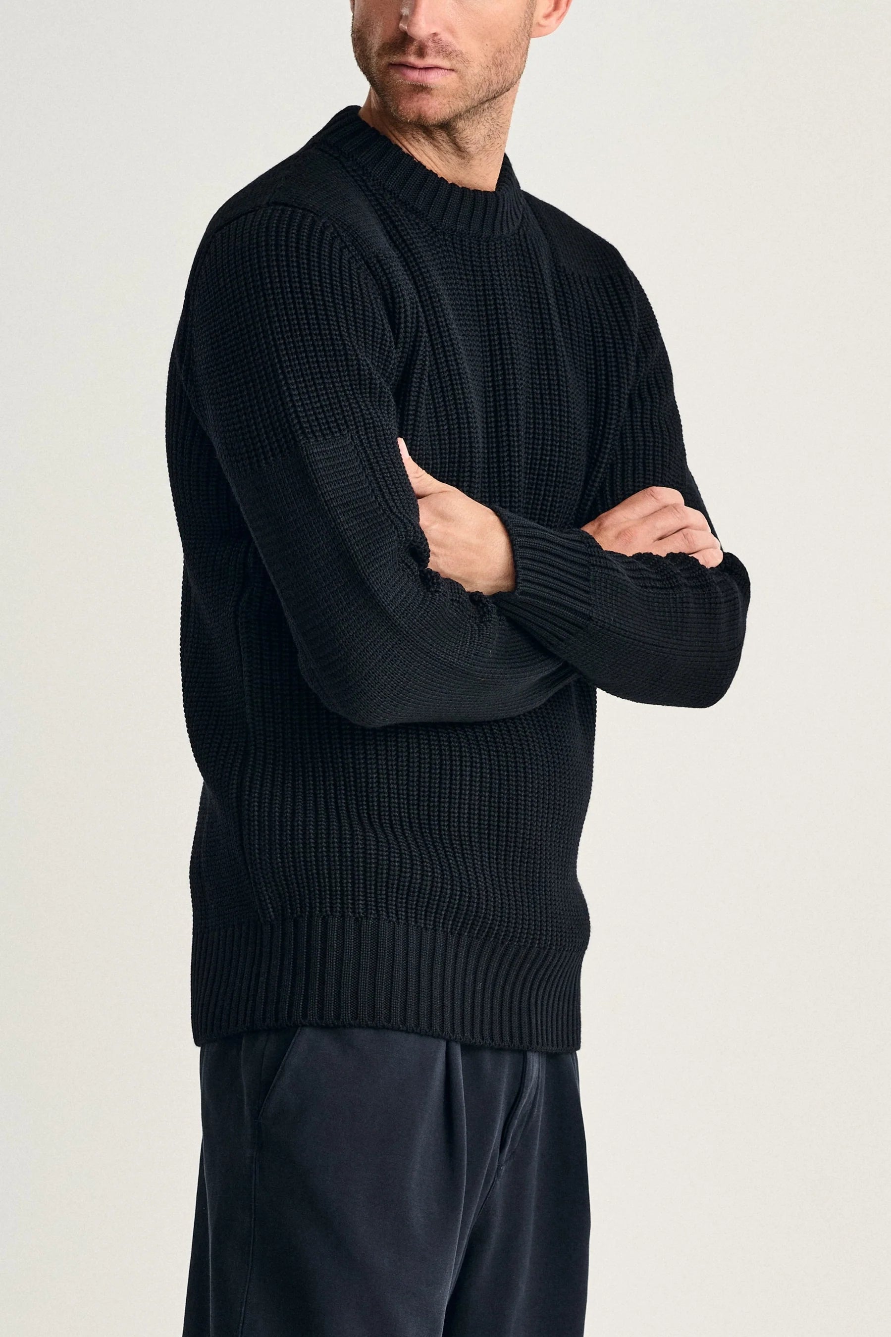 DESIGN | Robust crew referencing 1970s Danish Civil Defense knits. Knitted shoulder and elbow fabric via unique technique. Heavy yet refined presence. |