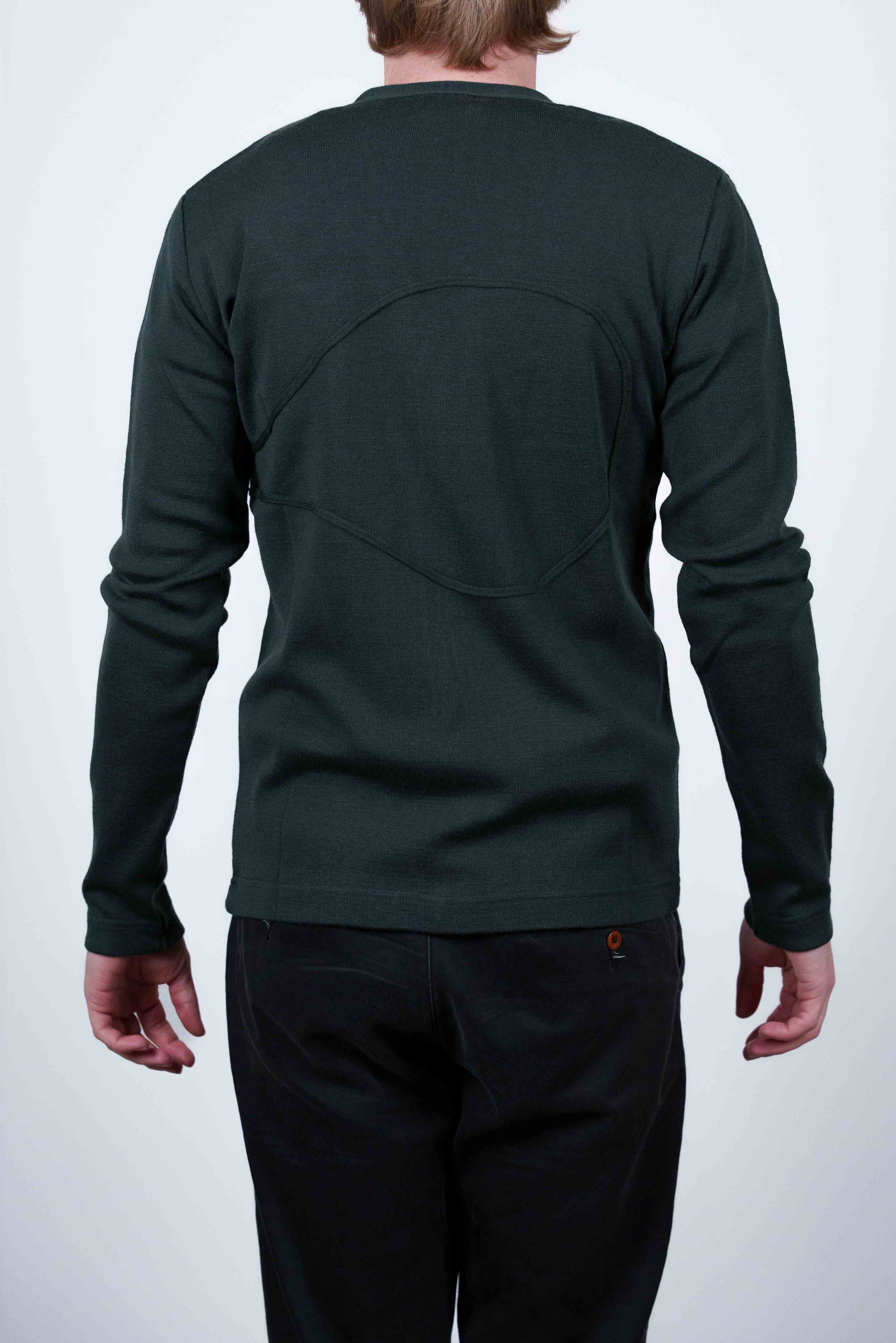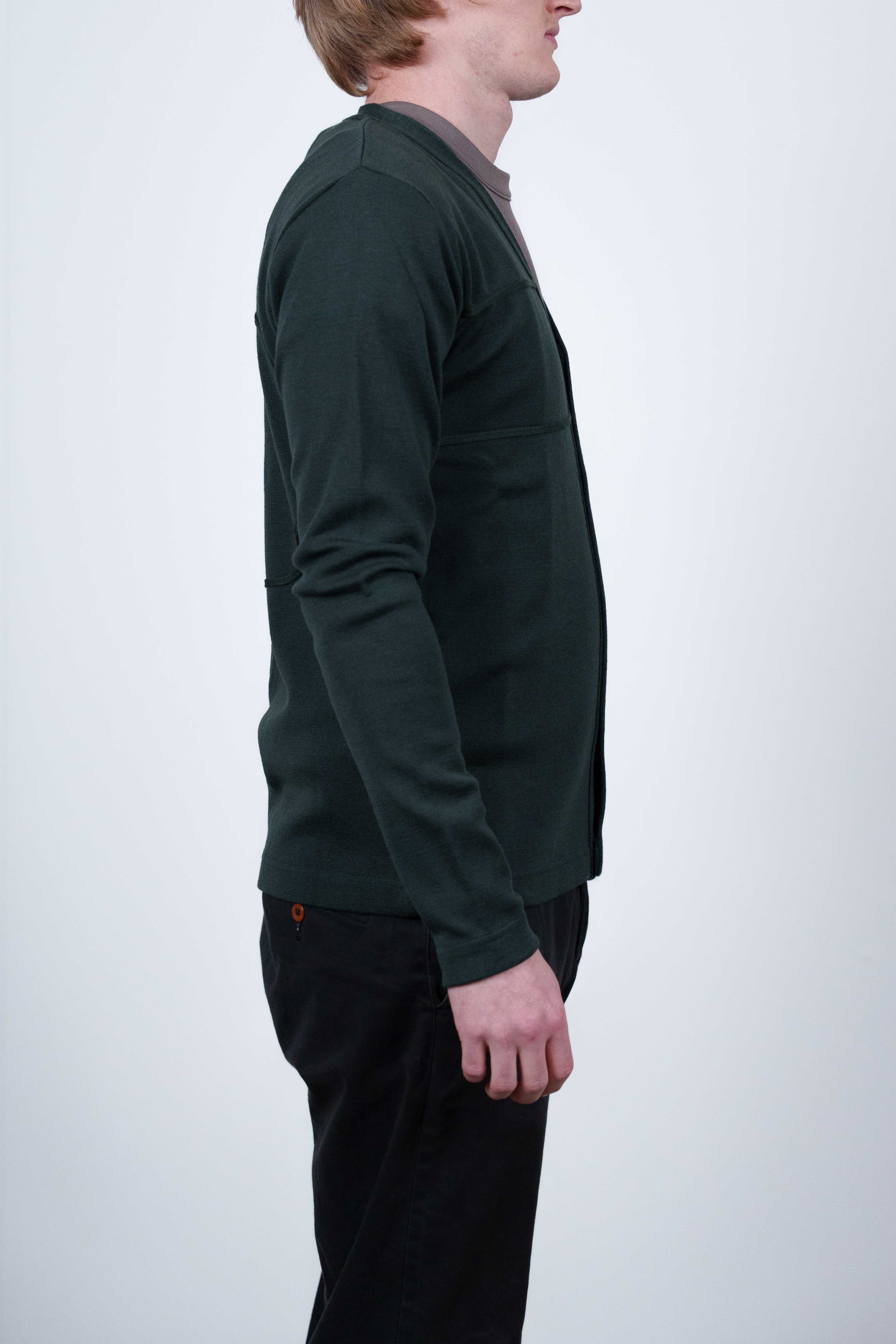 Dark green fine-gauge knit cardigan from the W014 collection, featuring a V-neck and a full front button closure with metal buttons. It has horizontal seam details across the chest and long sleeves with ribbed cuffs and hem.